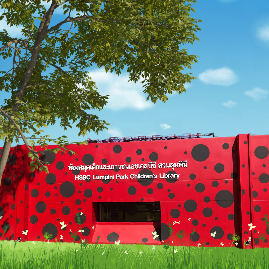 ใครเคยไปออกกำลังหายที่สวนลุมพินี คงจะเคยเห็น “ห้องสมุดเพื่อการเรียนรู้สวนลุมพินี” อาคารสีเหลืองนวลที่มีอายุกว่า 60 ปี ซ่อนตัวอยู่ในสวนแห่งนี้ แต่วันนี้เราจะพูดถึงห้องสมุดเด็ก HSBC หรือ “ห้องสมุดเต่าทอง” เชื่อมต่อกับห้องสมุดเดิม โดยตัวอาคารด้านนอกใช้สีแดง-ดำ คล้ายปีกแมลงเต่าทอง เพื่อให้เด็กๆ รู้สึกสนุก ส่วนภายในเปิดโล่งเน้นใช้ไม้สีอ่อนคู่กับสีขาว โดยตัวผนังใช้กราฟิกวงกลมสีแดง-ดำ หนังสือส่วนใหญ่ถูกจัดเก็บไว้ในชั้นหนังสือขนาดใหญ่ที่ล้อมรอบบริเวณอัฒจันทร์ ซึ่งถูกออกแบบให้เป็นที่นั่งอ่านหนังสือ และเด็กๆ ยังสามารถปีนป่ายขึ้นไปหยิบหนังสือได้ด้วย