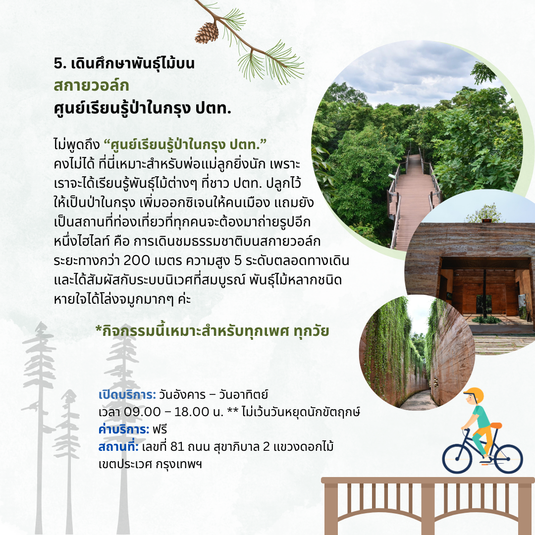 ไม่พูดถึง “ศูนย์เรียนรู้ป่าในกรุง ปตท.” คงไม่ได้ ที่นี่เหมาะสำหรับพ่อแม่ลูกยิ่งนัก เพราะเราจะได้เรียนรู้พันธุ์ไม้ต่างๆ ที่ชาว ปตท. ปลูกไว้ให้เป็นป่าในกรุง เพิ่มออกซิเจนให้คนเมือง แถมยังเป็นสถานที่ท่องเที่ยวที่ทุกคนจะต้องมาถ่ายรูปอีกหนึ่งไฮไลท์ คือ การเดินชมธรรมชาติบนสกายวอล์กระยะทางกว่า 200 เมตร ความสูง 5 ระดับตลอดทางเดิน และได้สัมผัสกับระบบนิเวศที่สมบูรณ์ พันธุ์ไม้หลากชนิด หายใจได้โล่งจมูกมากๆ ค่ะ