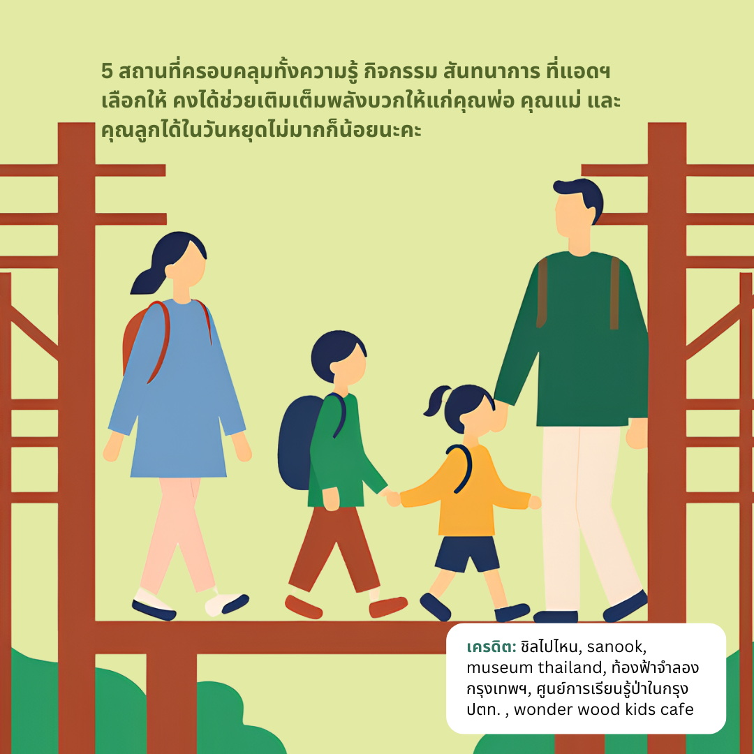 5 สถานที่ครอบคลุมทั้งความรู้ กิจกรรม สันทนาการ ที่แอดฯ เลือกให้ คงได้ช่วยเติมเต็มพลังบวกให้แก่คุณพ่อ คุณแม่ และคุณลูกได้ในวันหยุดไม่มากก็น้อยนะคะ