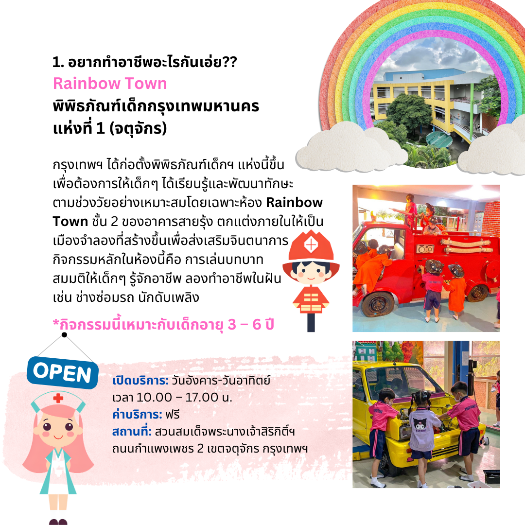 กรุงเทพฯ ได้ก่อตั้งพิพิธภัณฑ์เด็กฯ แห่งนี้ขึ้น เพื่อต้องการให้เด็กๆ ได้เรียนรู้และพัฒนาทักษะตามช่วงวัยอย่างเหมาะสมโดยเฉพาะห้อง ชั้น 2 ของอาคารสายรุ้ง ตกแต่งภายในให้เป็นเมืองจำลองที่สร้างขึ้นเพื่อส่งเสริมจินตนาการ กิจกรรมหลักในห้องนี้คือ การเล่นบทบาทสมมติให้เด็กๆ รู้จักอาชีพ ลองทำอาชีพในฝัน เช่น ช่างซ่อมรถ นักดับเพลิง