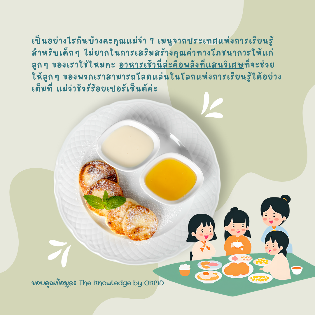 7 เมนูจากประเทศแห่งการเรียนรู้สำหรับเด็กๆ ไม่ยากในการเสริมสร้างคุณค่าทางโภชนาการให้แก่ลูกๆ ของเราใช่ไหมคะ อาหารเช้านี่ล่ะคือพลังที่แสนวิเศษที่จะช่วยให้ลูกๆ ของพวกเราสามารถโลดแล่นในโลกแห่งการเรียนรู้ได้อย่างเต็มที่ แม่ว่าชัวร์ร้อยเปอร์เซ็นต์ค่ะ