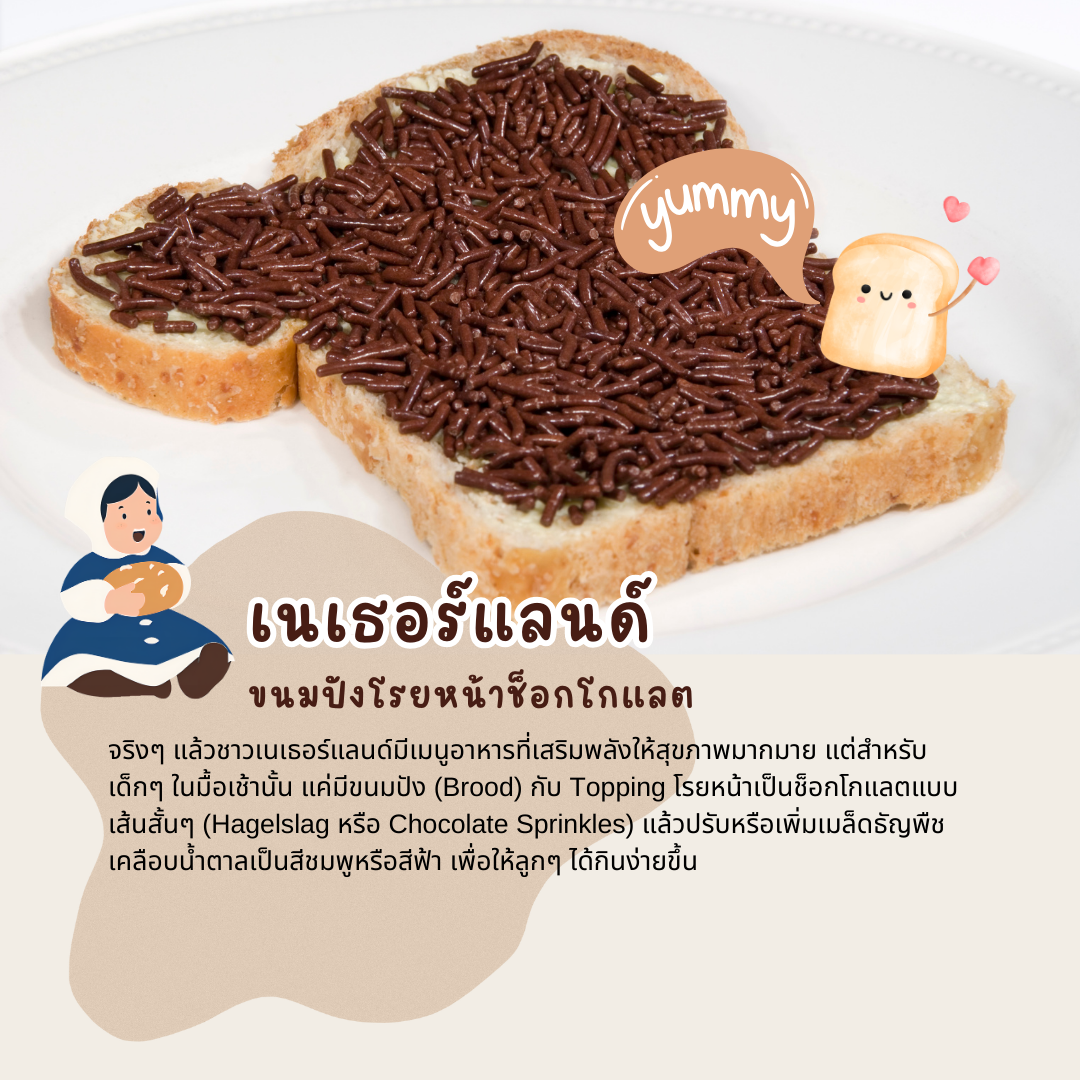 จริงๆ แล้วชาวเนเธอร์แลนด์มีเมนูอาหารที่เสริมพลังให้สุขภาพมากมาย แต่สำหรับเด็กๆ ในมื้อเช้านั้น แค่มีขนมปัง (Brood) กับ Topping โรยหน้าเป็นช็อกโกแลตแบบเส้นสั้นๆ (Hagelslag หรือ Chocolate Sprinkles) แล้วปรับหรือเพิ่มเมล็ดธัญพืชเคลือบน้ำตาลเป็นสีชมพูหรือสีฟ้า เพื่อให้ลูกๆ ได้กินง่ายขึ้น