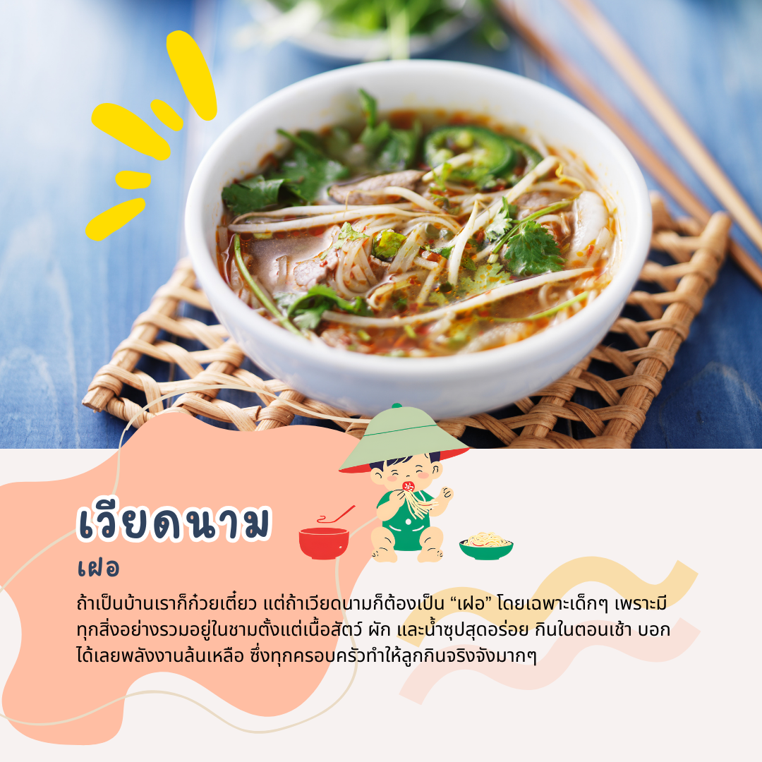 ถ้าเป็นบ้านเราก็ก๋วยเตี๋ยว แต่ถ้าเวียดนามก็ต้องเป็น “เฝอ” โดยเฉพาะเด็กๆ เพราะมีทุกสิ่งอย่างรวมอยู่ในชามตั้งแต่เนื้อสัตว์ ผัก และน้ำซุปสุดอร่อย กินในตอนเช้า บอกได้เลยพลังงานล้นเหลือ ซึ่งทุกครอบครัวทำให้ลูกกินจริงจังมากๆ