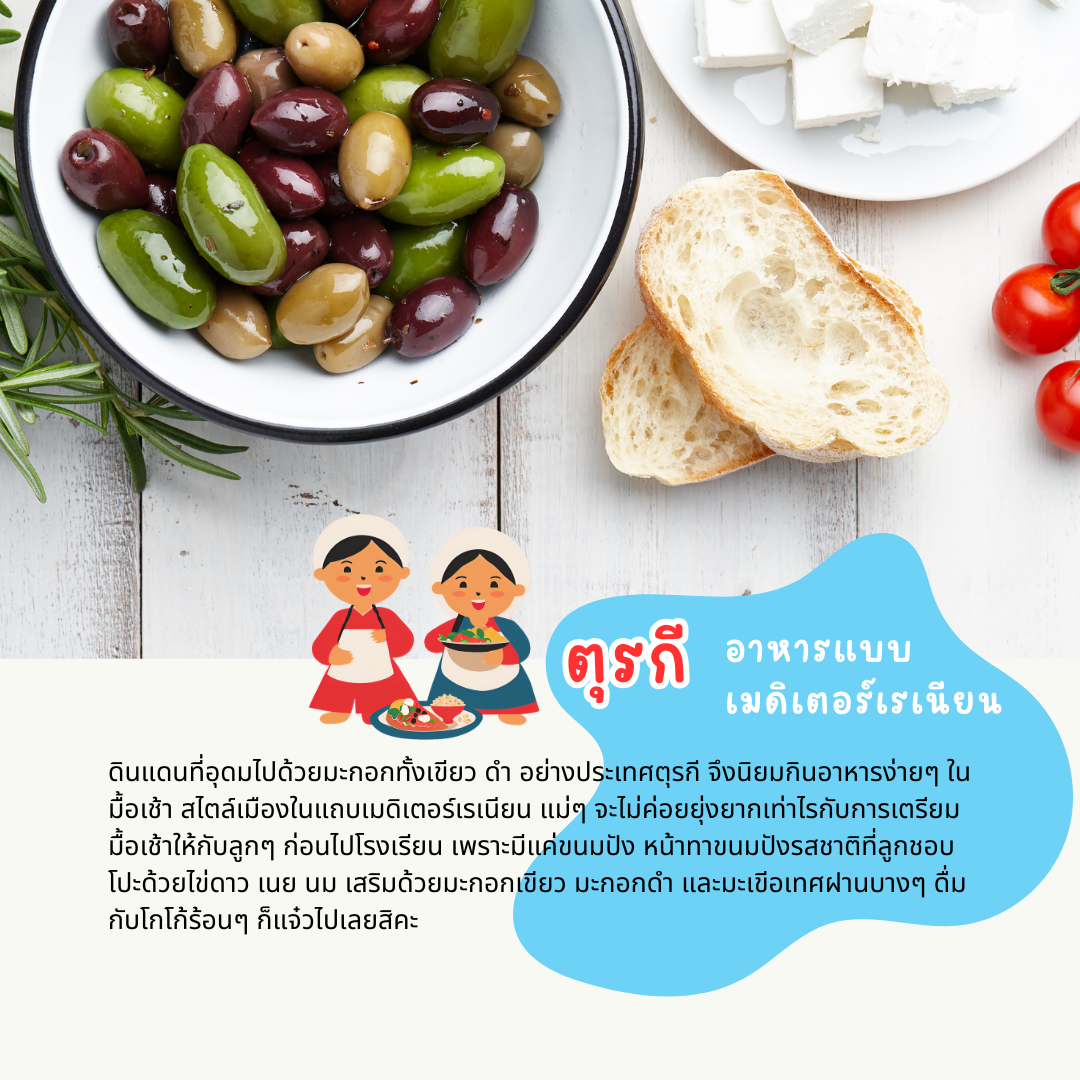 ดินแดนที่อุดมไปด้วยมะกอกทั้งเขียว ดำ อย่างประเทศตุรกี จึงนิยมกินอาหารง่ายๆ ในมื้อเช้า สไตล์เมืองในแถบเมดิเตอร์เรเนียน แม่ๆ จะไม่ค่อยยุ่งยากเท่าไรกับการเตรียมมื้อเช้าให้กับลูกๆ ก่อนไปโรงเรียน เพราะมีแค่ขนมปัง หน้าทาขนมปังรสชาติที่ลูกชอบ โปะด้วยไข่ดาว เนย นม เสริมด้วยมะกอกเขียว มะกอกดำ และมะเขีอเทศฝานบางๆ ดื่มกับโกโก้ร้อนๆ ก็แจ๋วไปเลยสิคะ