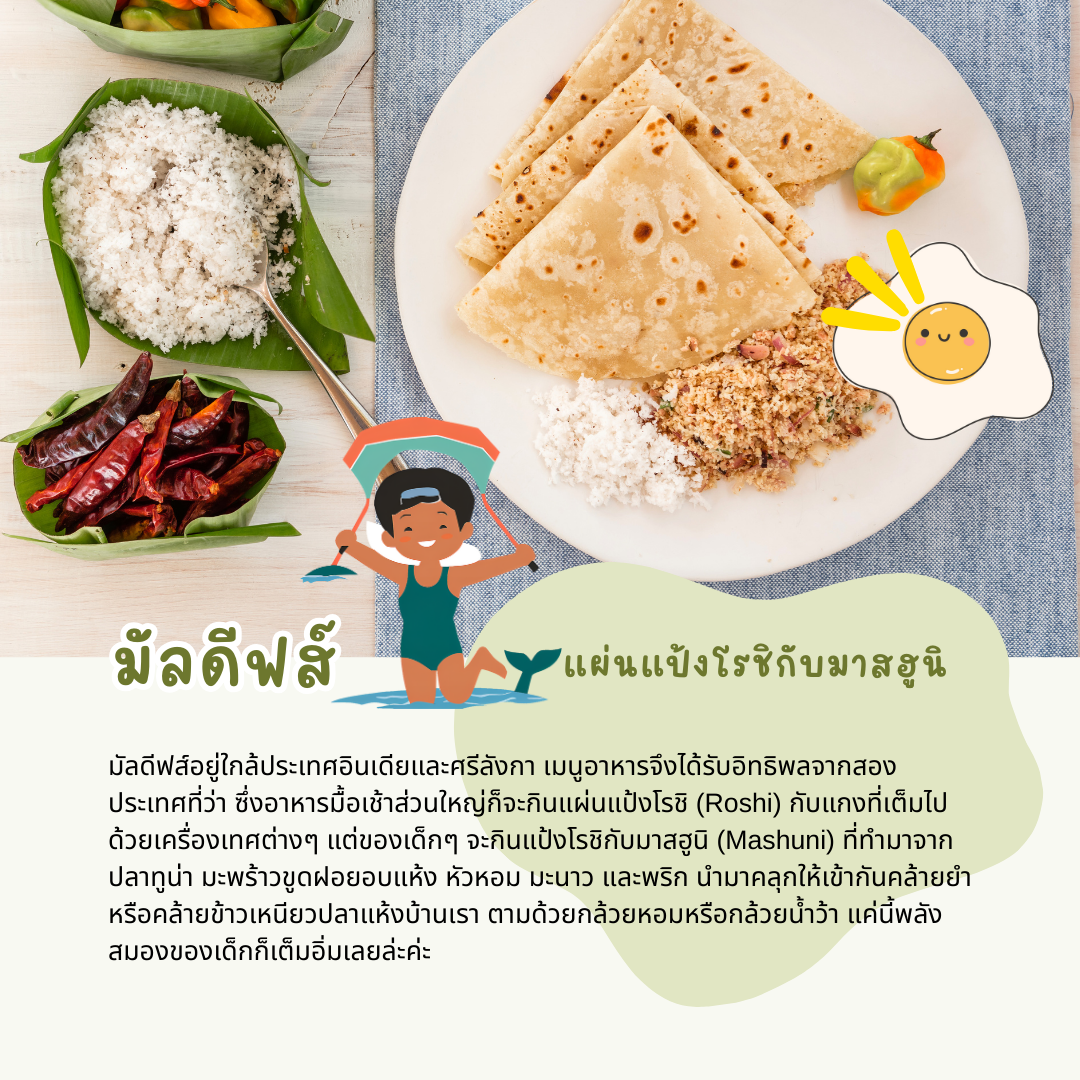 มัลดีฟส์อยู่ใกล้ประเทศอินเดียและศรีลังกา เมนูอาหารจึงได้รับอิทธิพลจากสองประเทศที่ว่า ซึ่งอาหารมื้อเช้าส่วนใหญ่ก็จะกินแผ่นแป้งโรชิ (Roshi) กับแกงที่เต็มไปด้วยเครื่องเทศต่างๆ แต่ของเด็กๆ จะกินแป้งโรชิกับมาสฮูนิ (Mashuni) ที่ทำมาจากปลาทูน่า มะพร้าวขูดฝอยอบแห้ง หัวหอม มะนาว และพริก นำมาคลุกให้เข้ากันคล้ายยำ หรือคล้ายข้าวเหนียวปลาแห้งนเรา ตามด้วยกล้วยหอมหรือกล้วยน้ำว้า แค่นี้พลังสมองของเด็กก็เต็มอิ่มเลยล่ะค่ะ