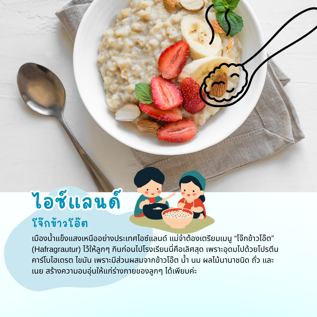 เมืองน้ำแข็งแสงเหนืออย่างประเทศไอซ์แลนด์ แม่จ๋าต้องเตรียมเมนู “โจ๊กข้าวโอ๊ต” (Hafragrautur) ไว้ให้ลูกๆ กินก่อนไปโรงเรียนนี่คือเลิศสุด เพราะอุดมไปด้วยโปรตีน คาร์โบไฮเดรต ไขมัน เพราะมีส่วนผสมจากข้าวโอ๊ต น้ำ นม ผลไม้นานาชนิด ถั่ว และเนย สร้างความอบอุ่นให้แก่ร่างกายของลูกๆ ได้เพียบค่ะ