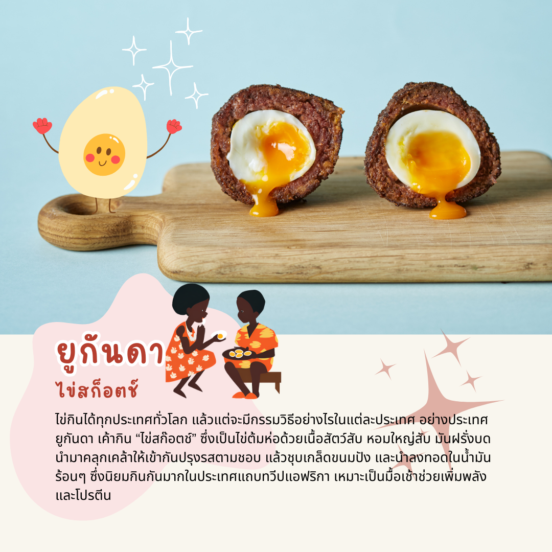 ไข่กินได้ทุกประเทศทั่วโลก แล้วแต่จะมีกรรมวิธีอย่างไรในแต่ละประเทศ อย่างประเทศยูกันดา เค้ากิน “ไข่สก๊อตช์” ซึ่งเป็นไข่ต้มห่อด้วยเนื้อสัตว์สับ หอมใหญ่สับ มันฝรั่งบด นำมาคลุกเคล้าให้เข้ากันปรุงรสตามชอบ แล้วชุบเกล็ดขนมปัง และนำลงทอดในน้ำมันร้อนๆ ซึ่งนิยมกินกันมากในประเทศแถบทวีปแอฟริกา เหมาะเป็นมื้อเช้าช่วยเพิ่มพลังและโปรตีน