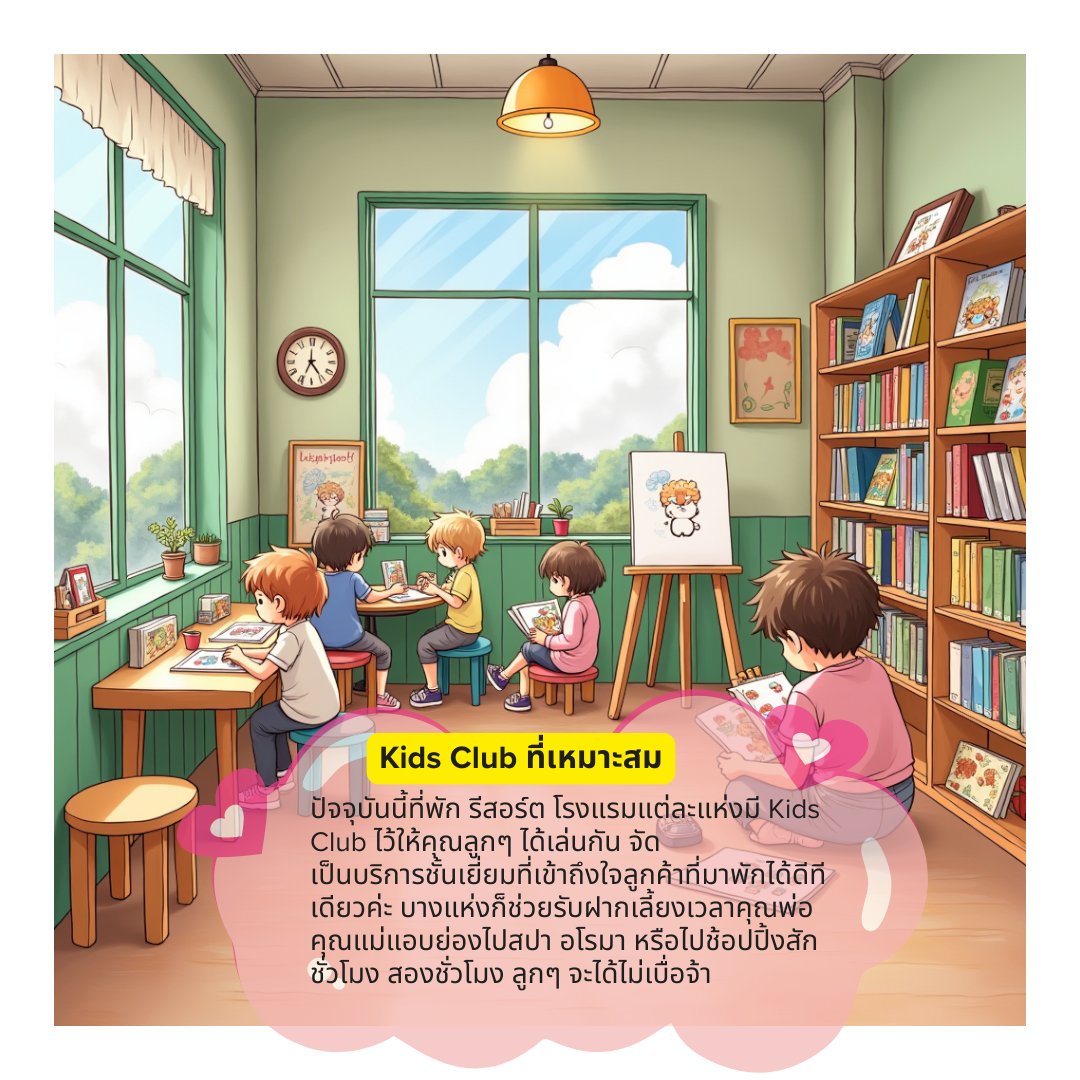 ปัจจุบันนี้ที่พัก รีสอร์ต โรงแรมแต่ละแห่งมี Kids Club ไว้ให้คุณลูกๆ ได้เล่นกัน จัดเป็นบริการชั้นเยี่ยมที่เข้าถึงใจลูกค้าที่มาพักได้ดีทีเดียวค่ะ บางแห่งก็ช่วยรับฝากเลี้ยงเวลาคุณพ่อ คุณแม่แอบย่องไปสปา อโรมา หรือไปช้อปปิ้งสักชั่วโมง สองชั่วโมง ลูกๆ จะได้ไม่เบื่อจ้า