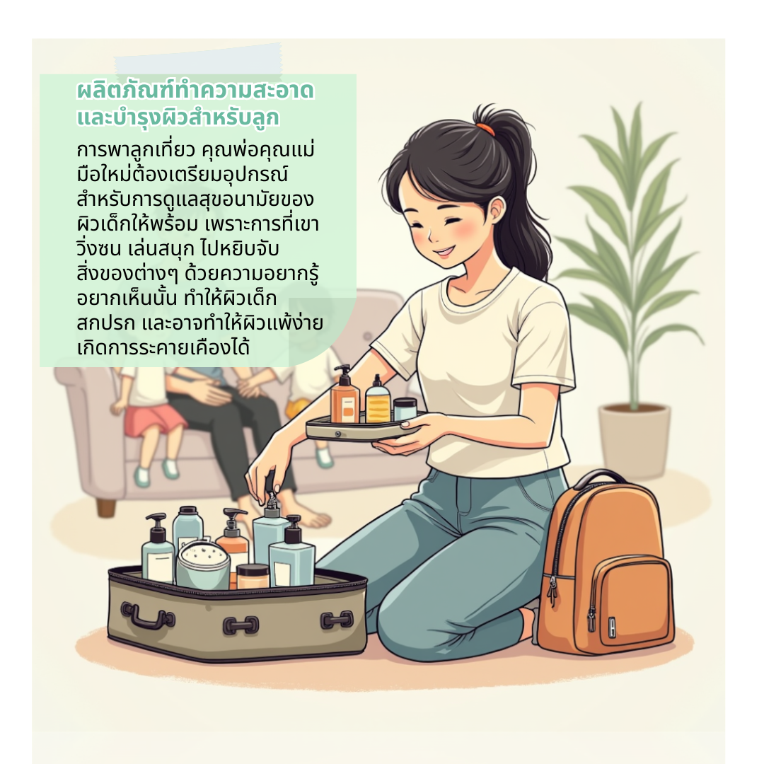 การพาลูกเที่ยว คุณพ่อคุณแม่มือใหม่ต้องเตรียมอุปกรณ์สำหรับการดูแลสุขอนามัยของผิวเด็กให้พร้อม เพราะการที่เขาวิ่งซน เล่นสนุก ไปหยิบจับสิ่งของต่างๆ ด้วยความอยากรู้อยากเห็นนั้น ทำให้ผิวเด็กสกปรก และอาจทำให้ผิวแพ้ง่าย เกิดการระคายเคืองได้