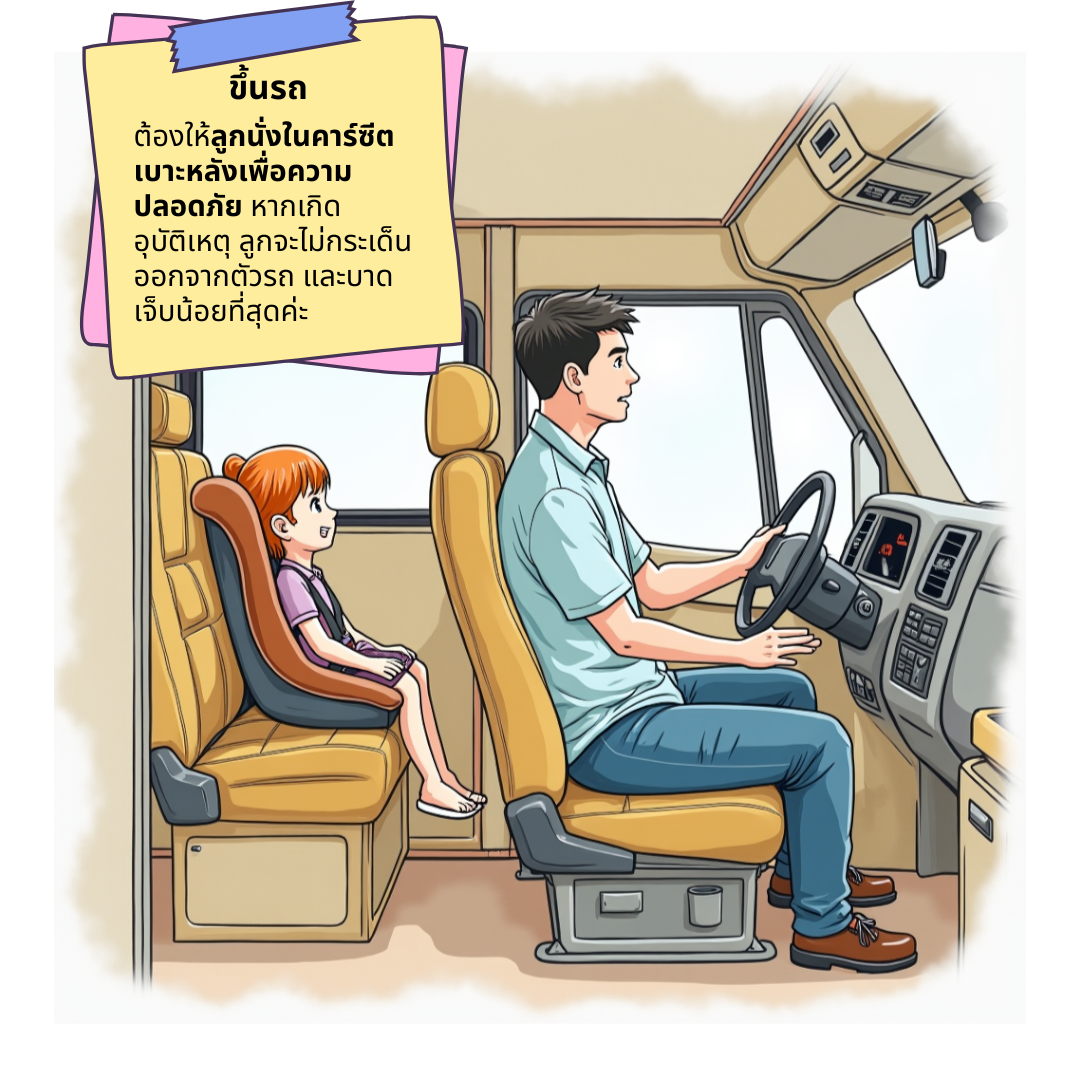 ต้องให้ลูกนั่งในคาร์ซีตเบาะหลังเพื่อความปลอดภัย หากเกิดอุบัติเหตุ ลูกจะไม่กระเด็นออกจากตัวรถ และบาดเจ็บน้อยที่สุดค่ะ นอกจากนี้ก็ต้องมีขนมขบเคี้ยว ลูกอมไว้กินเพลินๆ แก้ง่วง หรือกรณีมีลูกเล็กก็ต้องเตรียม นม ผ้าอ้อม อาหารสำหรับเด็กในช่วงวัยที่เหมาะสม และหมั่นพักรถบ่อยๆ เพราะจะได้ยืดเส้นยืดสาย เข้าห้องน้ำทำธุระ เปลี่ยนผ้าอ้อมให้ลูก ไม่งั้นเด็กจะเครียดในการเดินทางมากเกินไป