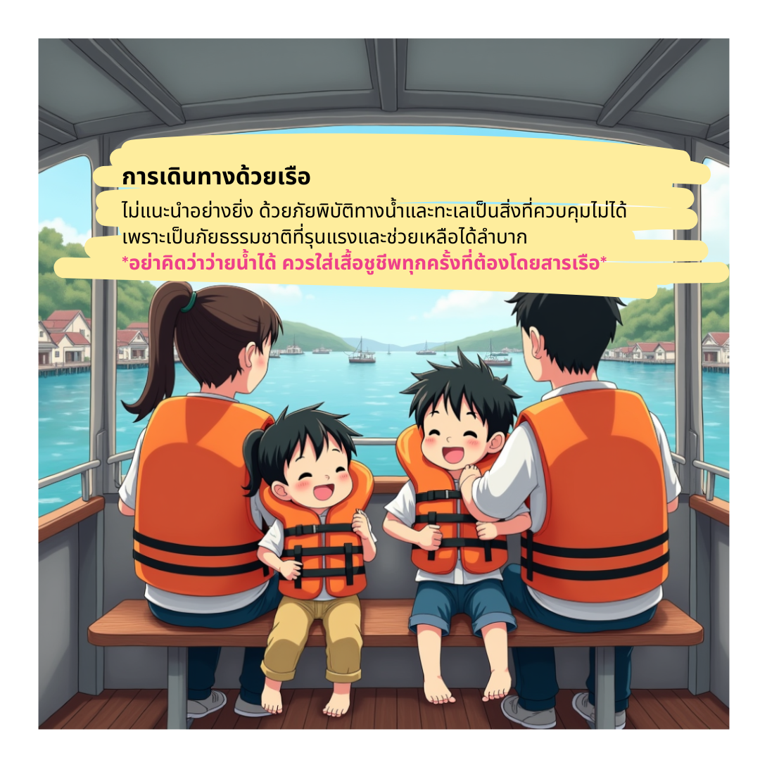 การเดินทางโดยเรือจะไม่แนะนำเลยเพราะถ้ามีภัยพิบัติทางน้ำและทะเลเป็นอะไรที่ควบคุมไม่ได้ เนื่องจากมักเป็นภัยธรรมชาติที่รุนแรงและช่วยเหลือได้ลำบาก