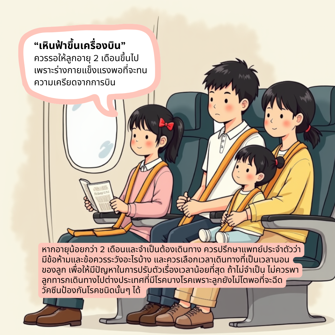 การพาลูกเที่ยวแบบขึ้นเครื่องบิน แม้จะทำให้ถึงจุดหมายปลายทางได้รวดเร็ว และบนเครื่องบินก็มีสิ่งอำนวยความสะดวกให้แก่คุณแม่ คุณลูกได้ในทุกช่วงวัยแล้วก็ตาม แต่คุณหมอก็ไม่อยากแนะนำให้ลูกวัยแรกเกิดหรือยังไม่ถึง 2 เดือนขึ้นไปเหินฟ้าอย่างแน่นอนค่ะ
