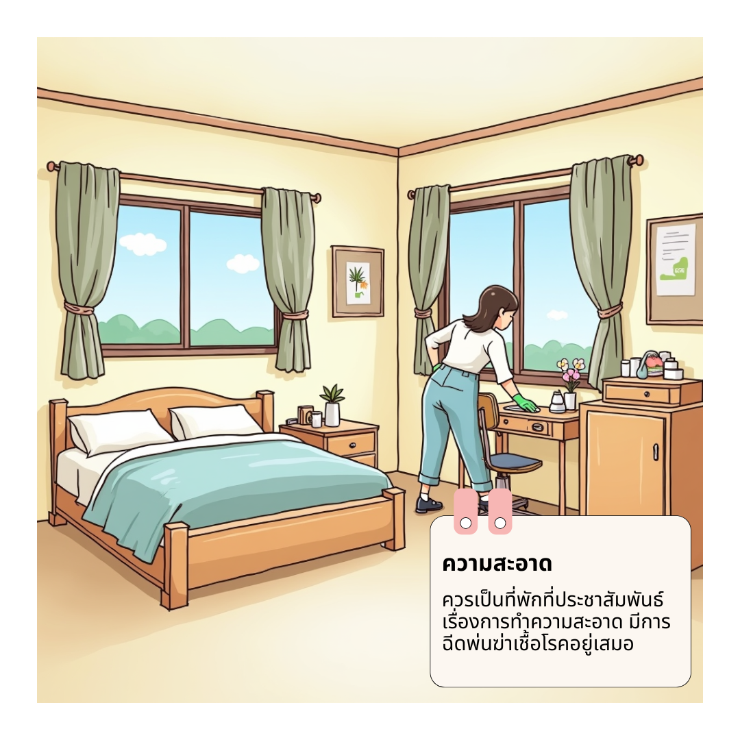 การเลือกเฟ้นหาที่พักให้ลูกน้อยของเรา ให้มองไปเรื่อง “ความสะอาด” เป็นสำคัญ เราสามารถค้นหาโรงแรมที่พักที่ประชาสัมพันธ์เรื่องนี้ เช่น การฉีดพ่นน้ำยาฆ่าเชื้อโรคอย่างสม่ำเสมอ
