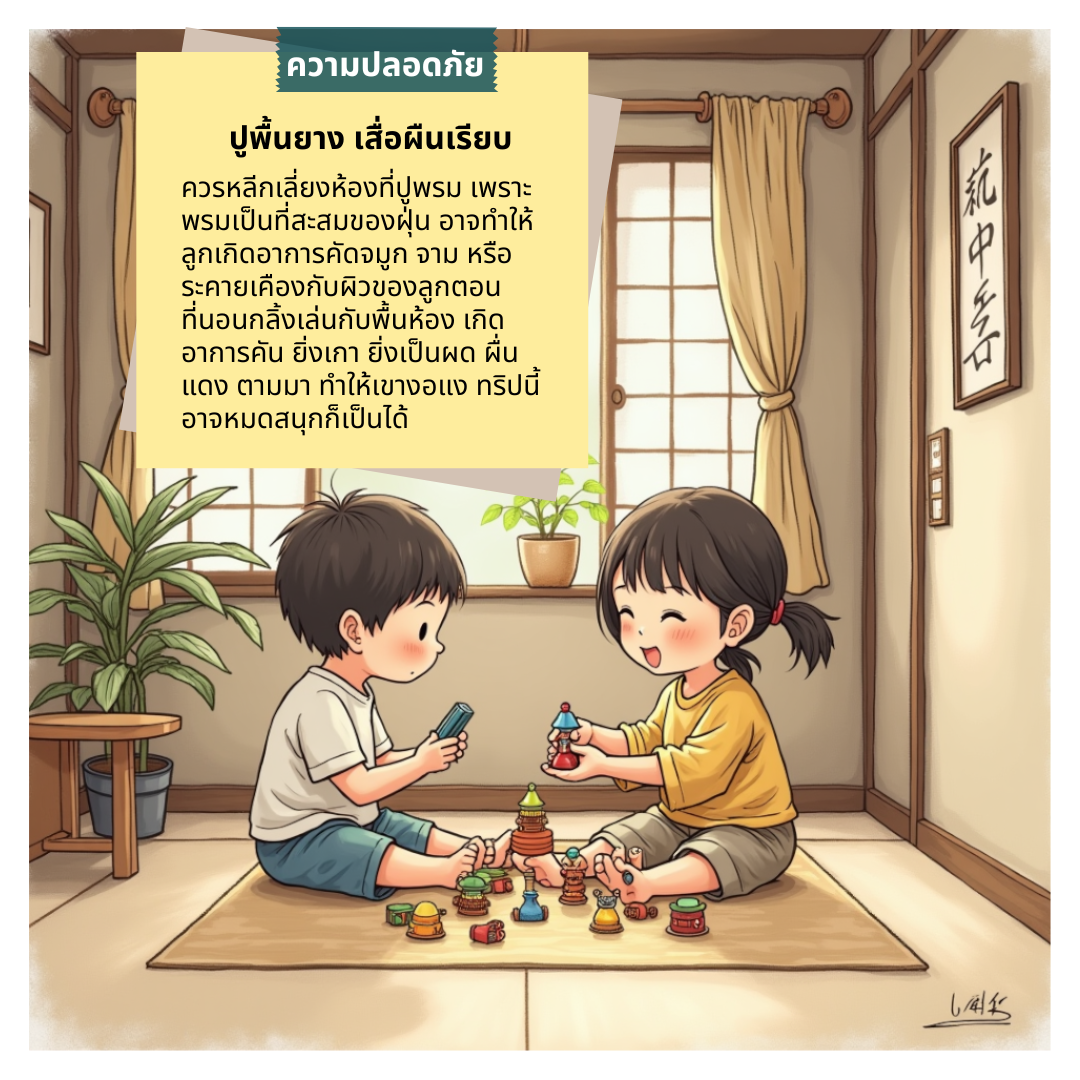 ควรหลีกเลี่ยงห้องที่ปูพรม เพราะพรมเป็นที่สะสมของฝุ่น อาจทำให้ลูกเกิดอาการคัดจมูก จาม หรือระคายเคืองกับผิวของลูกตอนที่นอนกลิ้งเล่นกับพื้นห้อง เกิดอาการคัน ยิ่งเกา ยิ่งเป็นผด ผื่นแดง ตามมา ทำให้เขางอแง ทริปนี้อาจหมดสนุกก็เป็นได้