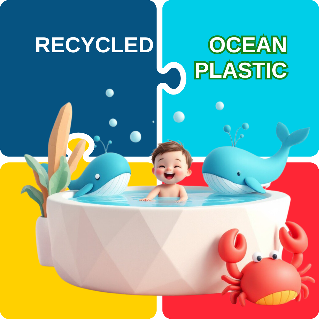 ของเล่นที่ผลิตจากขยะพลาสติกที่ถูกรวบรวมจากมหาสมุทร ทะเล และแนวชายฝั่ง แล้วนำไปแปรรูปและแปรรูปเป็นผลิตภัณฑ์ใหม่ผ่านการรีไซเคิล เช่น ของเล่นอาบน้ำ Whale Bath Toy by EKOBO