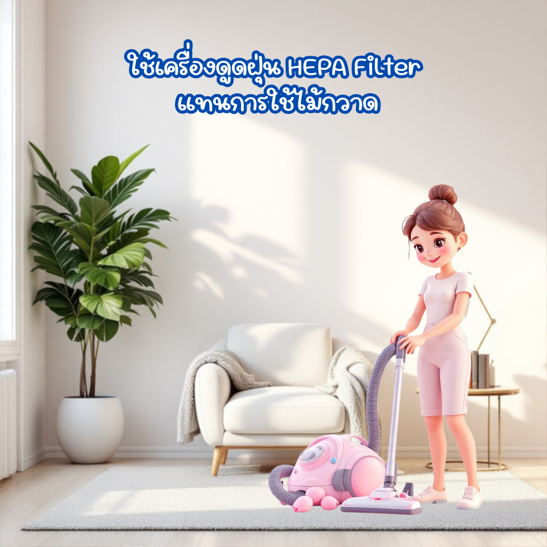 - ใช้เครื่องดูดฝุ่น HEPA Filter แทนการกวาดด้วยไม้กวาด