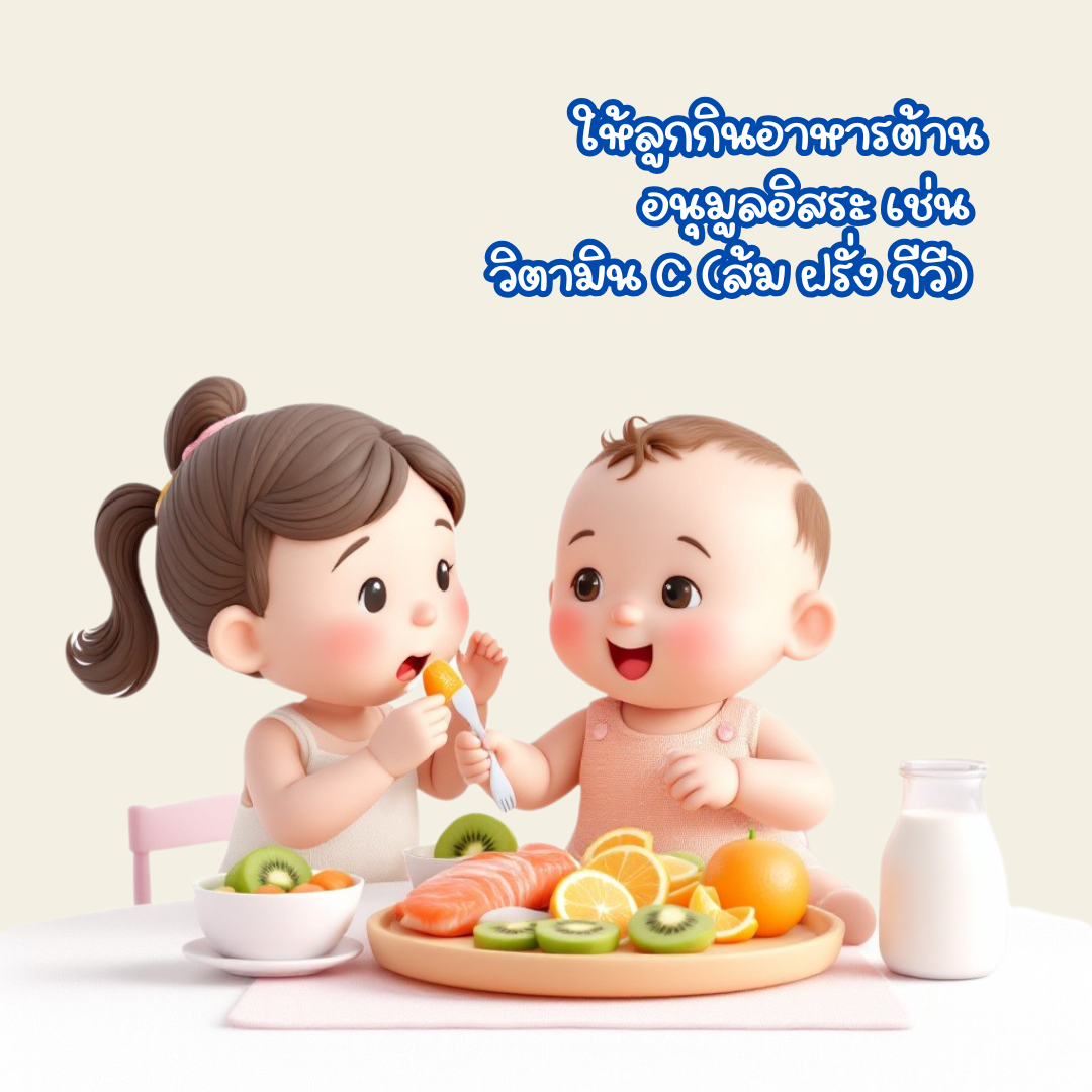 - ให้ลูกกินอาหารที่ช่วย ต้านอนุมูลอิสระ เช่น วิตามิน C (ส้ม ฝรั่ง กีวี) โอเมก้า 3 (ปลาแซลมอน ถั่ววอลนัท) เบต้าแคโรทีน (แครอท ฟักทอง)