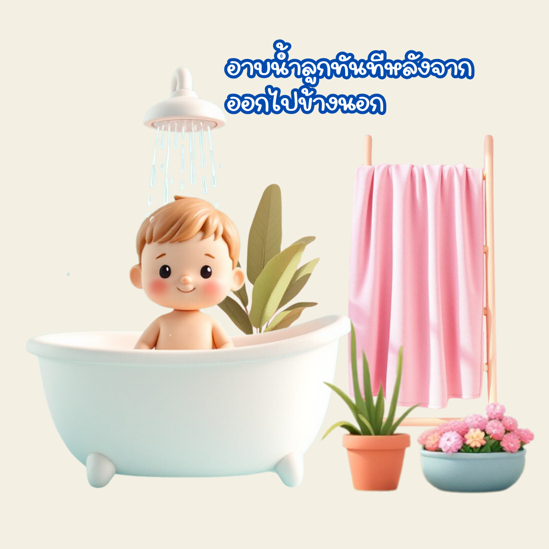 - ควรให้ลูกอาบน้ำทันที เพราะฝุ่น PM2.5 อาจติดอยู่ตามผมและเสื้อผ้า