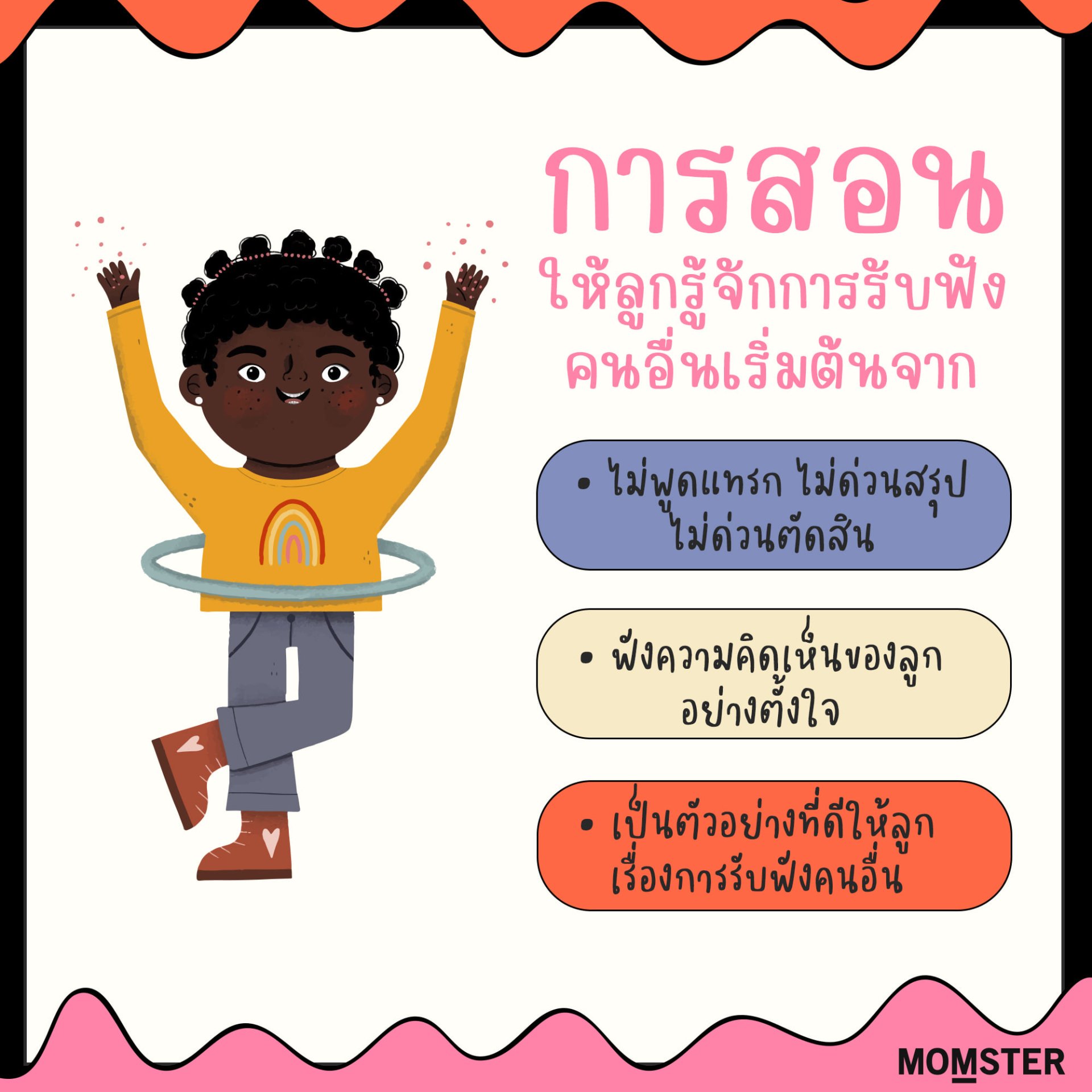 1. พ่อแม่ต้องรับฟังสิ่งความคิดเห็นของลูก หรืออธิบายสิ่งที่ลูกทำลงไปด้วยเหตุผล และต้องไม่พูดแทรก ไม่ด่วนสรุป ไม่ด่วนตัดสินว่าผิดหรือถูก ข้อนี้จะทำให้พ่อแม่ได้รับรู้ความรู้สึกนึกคิดเกี่ยวกับเรื่องต่างๆ ของลูกได้ด้วย