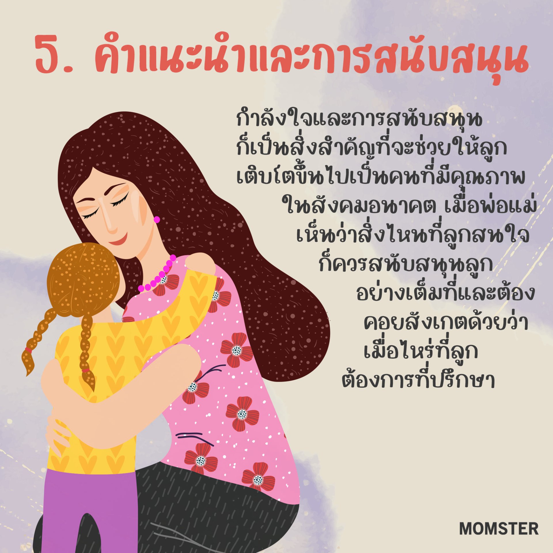 นอกจากเด็กจะต้องการความรัก ความอบอุ่นจากพ่อแม่แล้ว กำลังใจและการสนับสนุนก็เป็นสิ่งสำคัญที่จะช่วยให้ลูกเติบโตขึ้นไปเป็นคนที่มีคุณภาพในสังคมอนาคต เมื่อพ่อแม่เห็นว่าสิ่งไหนที่ลูกสนใจก็ควรสนับสนุนลูกอย่างเต็มที่ และต้องคอยสังเกตด้วยว่าเมื่อไหร่ที่ลูกต้องการที่ปรึกษา