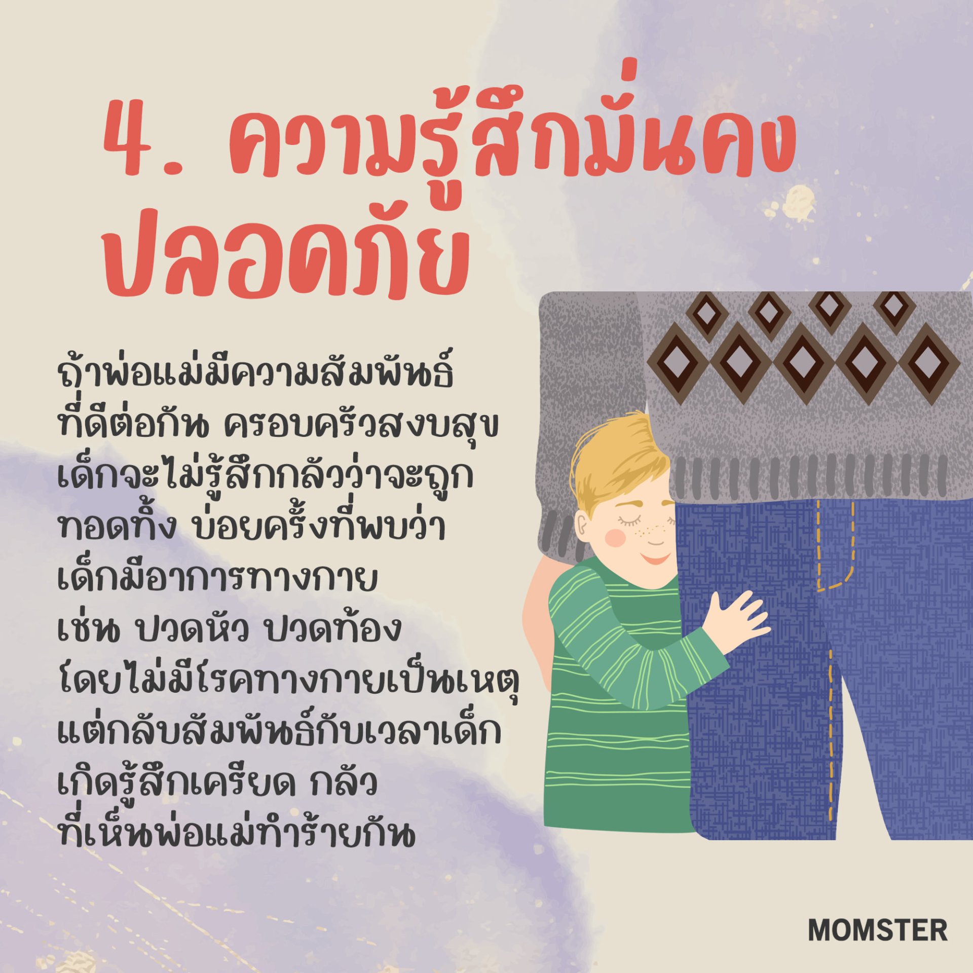 ความรู้สึกมั่งคงปลอดภัยของเด็กได้มาจากสิ่งแวดล้อมรอบข้าง โดยเฉพาะพ่อแม่ ถ้าพ่อแม่มีความสัมพันธ์ที่ดีต่อกัน ครอบครัวสงบสุข เด็กจะไม่รู้สึกกลัวว่าจะถูกทอดทิ้ง บ่อยครั้งที่พบว่าเด็กมีอาการทางกาย เช่น ปวดหัว ปวดท้อง โดยไม่มีโรคทางกายเป็นเหตุ แต่กลับสัมพันธ์กับเวลาเด็กเกิดรู้สึกเครียด รู้สึกกลัวที่เห็นพ่อแม่ทะเลาะกันทำร้ายร่างกายกัน หรือกำลังจะหย่าร้างกัน นอกจากนั้นเด็กก็ยังต้องการความรู้สึกว่าผู้ใหญ่สามารถปกป้องเค้าได้