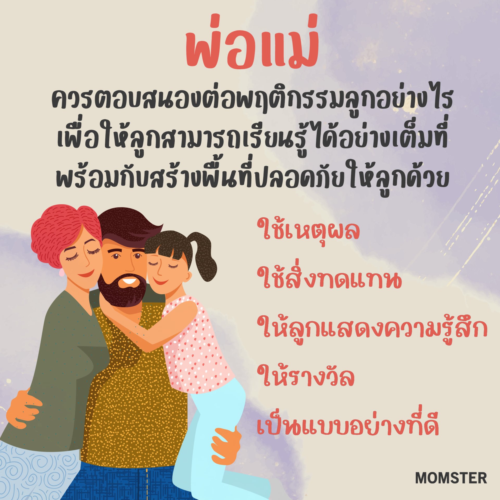 พ่อแม่มีวิธีตอบสนองต่อพฤติกรรมของลูกอย่างไร ให้เหมาะสม เพื่อให้ลูกสามารถเรียนรู้ได้อย่างเต็มที่ พร้อมกับสร้างพื้นที่ปลอดภัยให้ลูกด้วย ใช้เหตุผล (Reasoning) การให้หลักเหตุผลง่ายๆ สั้นๆ อย่างตรงไปตรงมา เพื่อให้เด็กเข้าใจ ใช้สิ่งทดแทน (Alternative response) เวลาห้ามไม่ให้เด็กทำสิ่งหนึ่งสิ่งใด ควรสอนเด็กไปด้วยว่าสิ่งไหนที่ทำแทนได้ เปิดโอกาสให้แสดงความคิดเห็นและความรู้สึก (Freedom to discuss ideas and feelings) ควรให้เด็กรู้สึกว่าเมื่อมีความคิดเห็นอย่างไรก็สามารถพูดออกมาได้อย่างอิสระ หรือมีความรู้สึกอย่างไรก็สามารถพูดคุยชี้แจงได้ ให้รางวัล (Positive reinforcement) เมื่อเด็กมีพฤติกรรมที่ถูกต้องเหมาะสมแล้ว เพื่อให้พฤติกรรมนั้นเกิดขึ้นอีกไม่หายไป ควรให้รางวัลสำหรับพฤติกรรมนั้น เช่น ชื่นชม โอบกอด ลูบหัว เป็นแบบอย่างที่ดี (Positive model) การเป็นแบบอย่างในด้านดีๆให้กับลูก คือหนึ่งในวิธีการสอนที่ได้ผลดีที่สุด