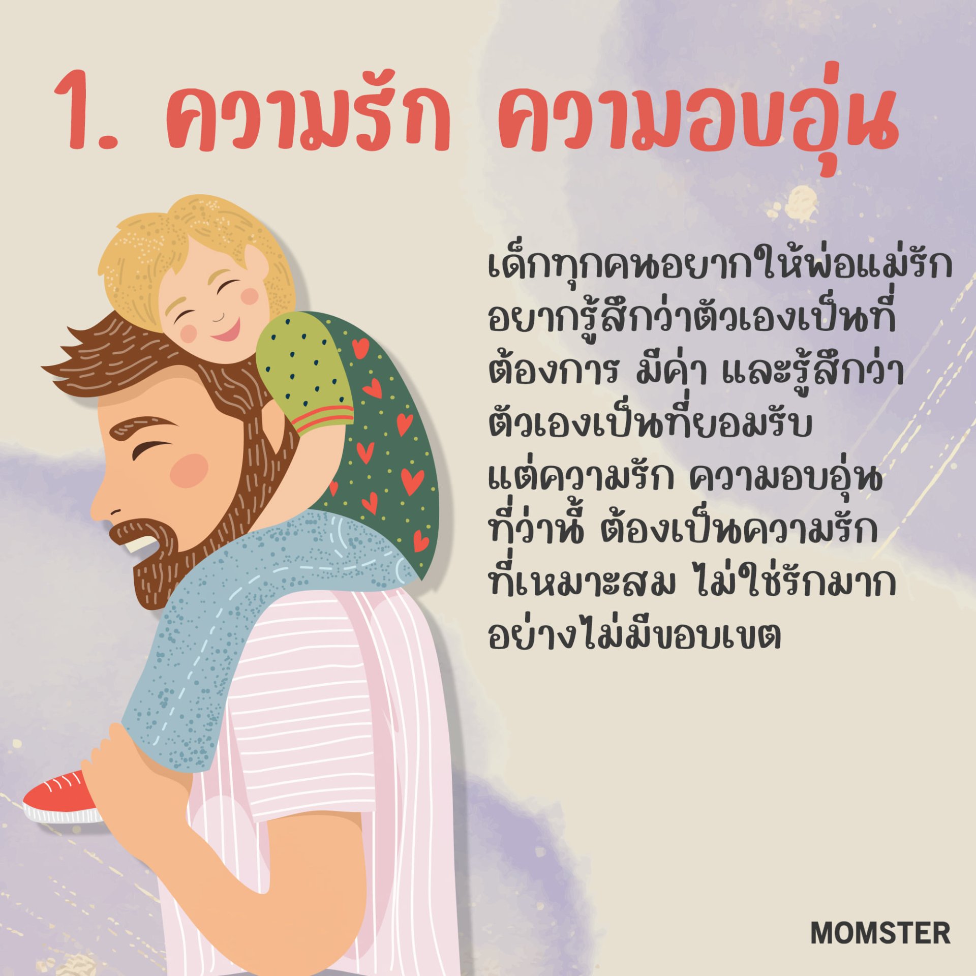เด็กทุกคนอยากให้พ่อแม่รัก อยากรู้สึกว่าตัวเองเป็นที่ต้องการ มีค่าสำหรับพ่อแม่ และรู้สึกว่าตัวเองเป็นที่ยอมรับ และไม่อยากรู้สึกว่าพ่อแม่รังเกียจ ไม่ชอบ ลำเอียง หรือเป็นส่วนเกิน แต่ความรักความอบอุ่นที่ว่านี้ ต้องเป็นความรักอย่างเหมาะสม ไม่ใช่รักมากอย่างไม่มีขอบเขต เช่น ตามใจทุกอย่างโดยไม่มีเหตุผล จนทำให้กลายเป็นคนตามใจตัวเองตลอดเวลา ไม่สามารถอดทนต่อภาวะที่คนปกติธรรมดาควรจะอดทนได้ จนกลายเป็นข้อบกพร่องทางบุคลิกภาพในอนาคต