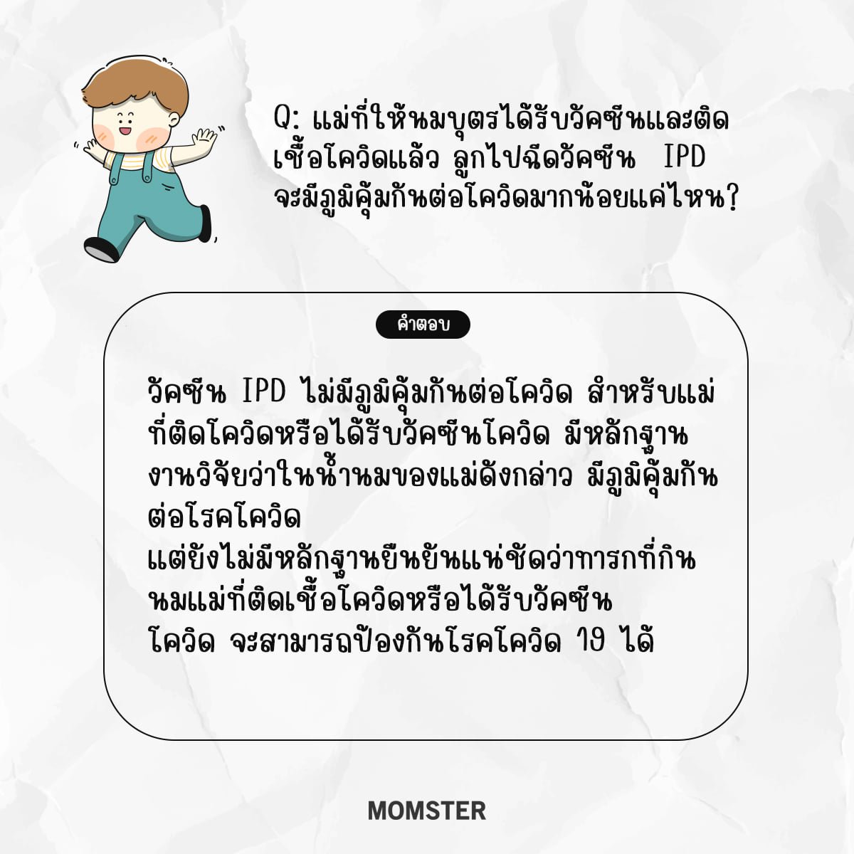 : วัคซีน IPD ไม่มีภูมิคุ้มกันต่อโรคโควิด สำหรับแม่ที่ติดโควิดหรือได้รับวัคซีนโควิด มีหลักฐานงานวิจัยว่าในน้ำนมของแม่ดังกล่าวมีภูมิคุ้มกันต่อโรคโควิด แต่ยังไม่มีหลักฐานยืนยันแน่ชัดว่าทารกที่กินนมแม่ที่ติดเชื้อโควิดหรือได้รับวัคซีนโควิด จะสามารถป้องกันโรคโควิด 19 ได้