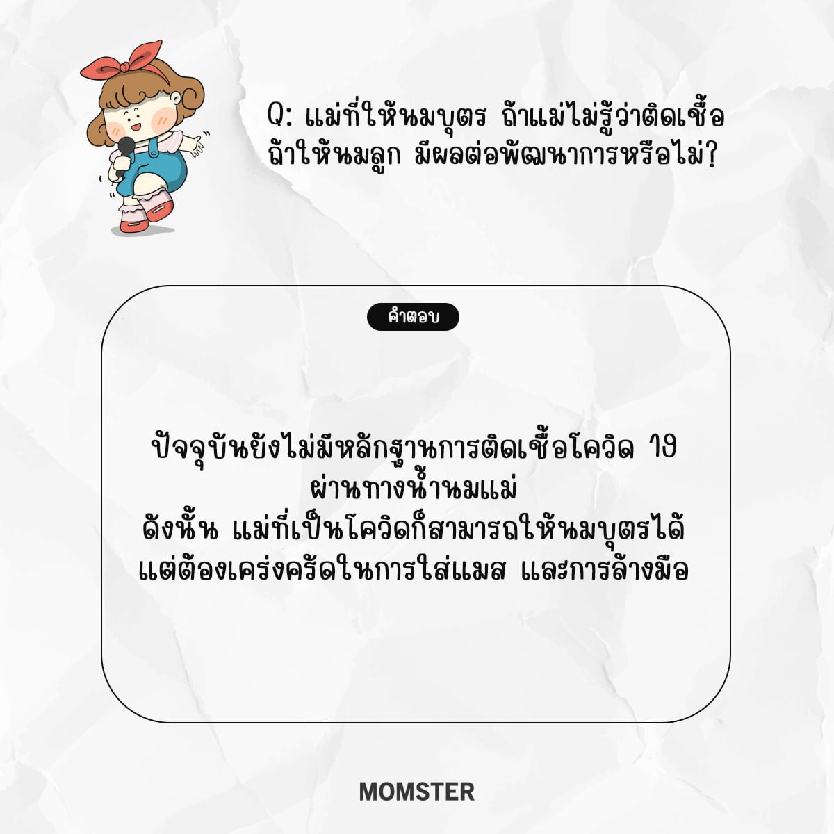 : ปัจจุบันยังไม่มีหลักฐานการติดเชื้อโควิดผ่านทางน้ำนมแม่ ดังนั้น แม่ที่เป็นโควิดก็สามารถให้นมบุตรได้ แต่ต้องเคร่งครัดในการใส่แมส และการล้างมือ