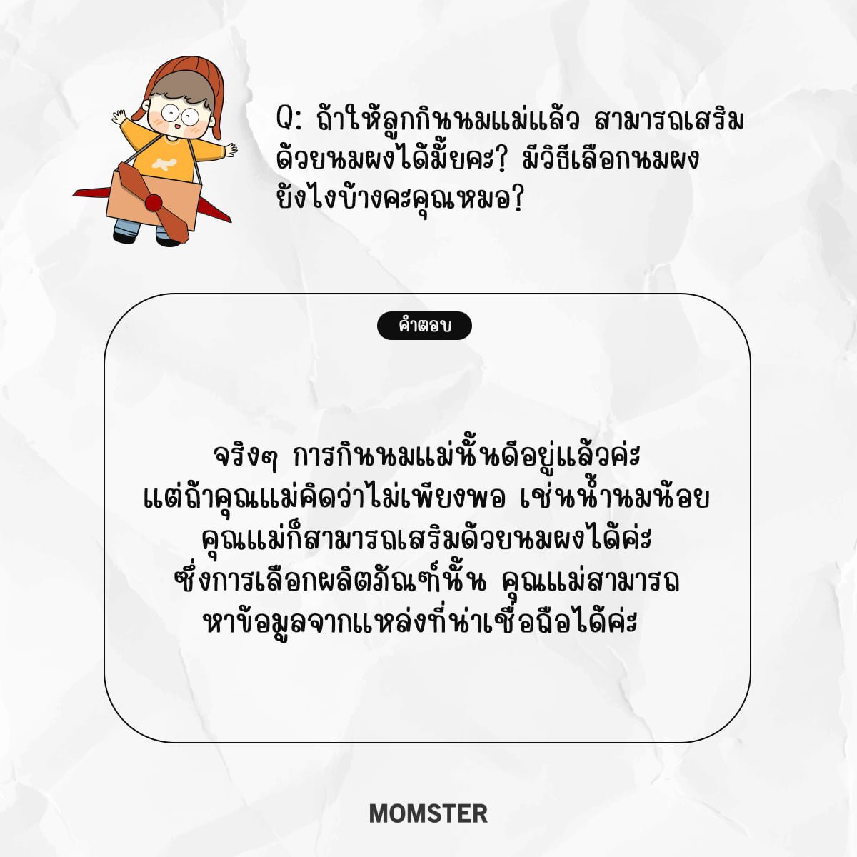 : จริงๆ การกินนมแม่นั้นดีอยู่แล้วค่ะ แต่ถ้าคุณแม่คิดว่าไม่เพียงพอ เช่นน้ำนมน้อย คุณแม่ก็สามารถเสริมด้วยนมผงได้ค่ะ ซึ่งการเลือกผลิตภัณฑ์นั้นคุณแม่สามารถหาข้อมูลจากแหล่งที่น่าเชื่อถือได้ค่ะ