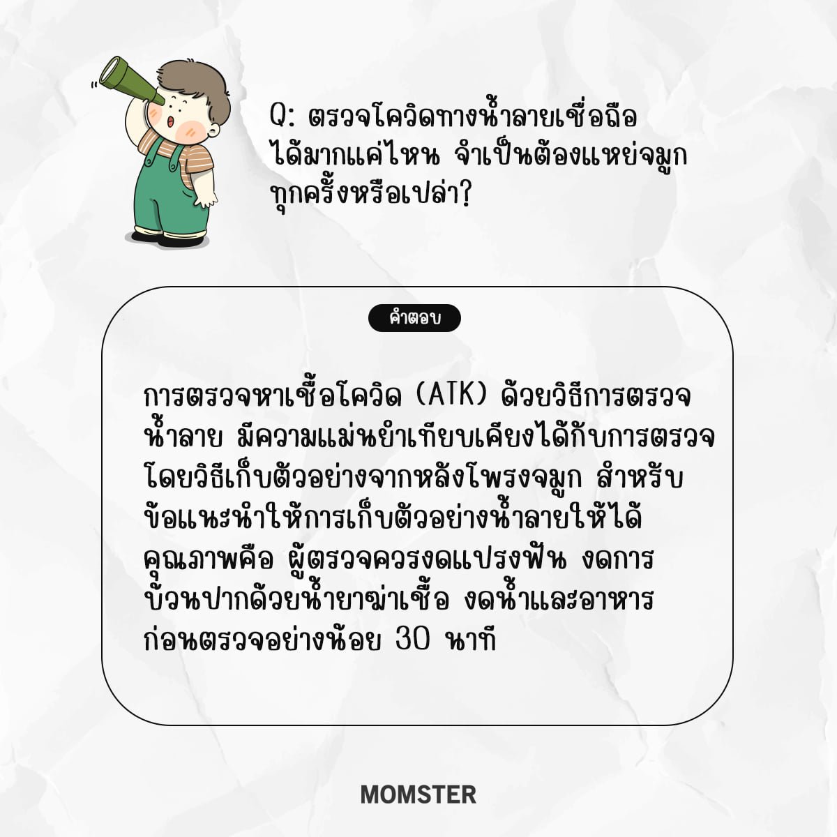 : การตรวจหาเชื้อโควิด (ATK) ด้วยวิธีการตรวจน้ำลาย มีความแม่นยำเทียบเคียงได้กับการตรวจโดยวิธีเก็บตัวอย่างจากหลังโพรงจมูก สำหรับข้อแนะนำให้การเก็บตัวอย่างน้ำลายให้ได้คุณภาพคือ ผู้ตรวจควรงดแปรงฟัน งดการบ้วนปากด้วยน้ำยาฆ่าเชื้อ งดน้ำและอาหารก่อนตรวจอย่างน้อย 30 นาที