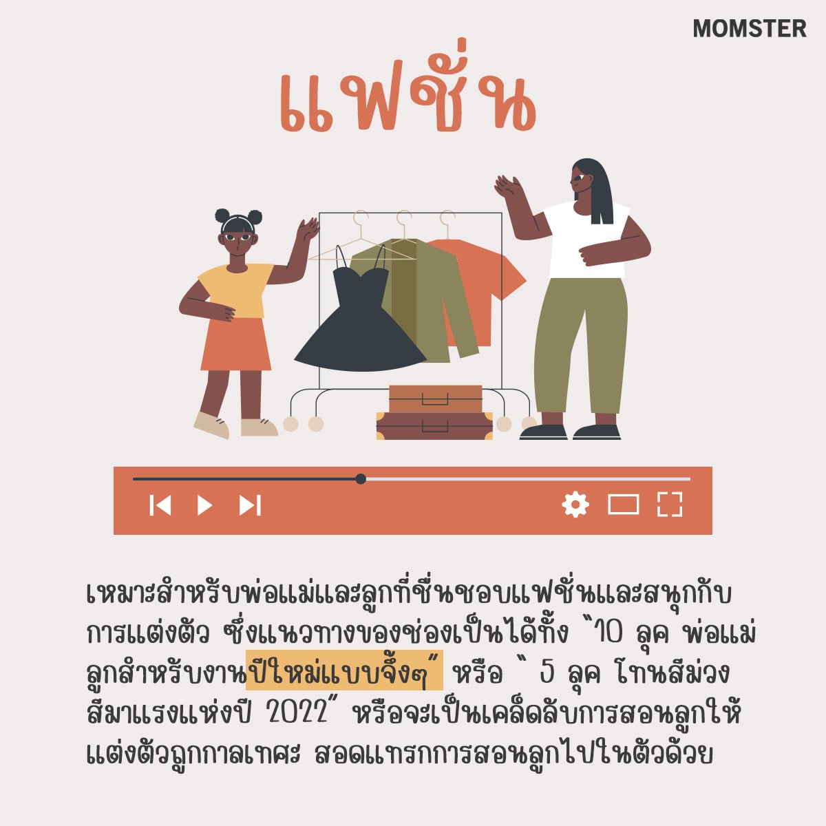 เหมาะสำหรับพ่อ แม่ และลูกที่ชื่นชอบแฟชั่นและสนุกกับการแต่งตัว ซึ่งแนวทางของช่องเป็นได้ทั้ง “10 ลุค พ่อแม่ลูกสำหรับงานปีใหม่แบบจึ้งๆ” หรือ “ 5 ลุค โทนสีม่วง สีมาแรงแห่งปี 2022” และ “เปลี่ยนเสื้อพ่อ/แม่ เป็นเสื้อลูก” หรือจะเป็นเคล็ดลับการสอนลูกให้แต่งตัวถูกกาลเทศะ ซึ่งนอกจากจะให้ไอเดียคนอื่นๆ ไปแต่งตัวตาม เด็กๆ ยังได้เรียนรู้เรื่องการเลือกเสื้อผ้าให้เหมาะสมด้วยค่ะ