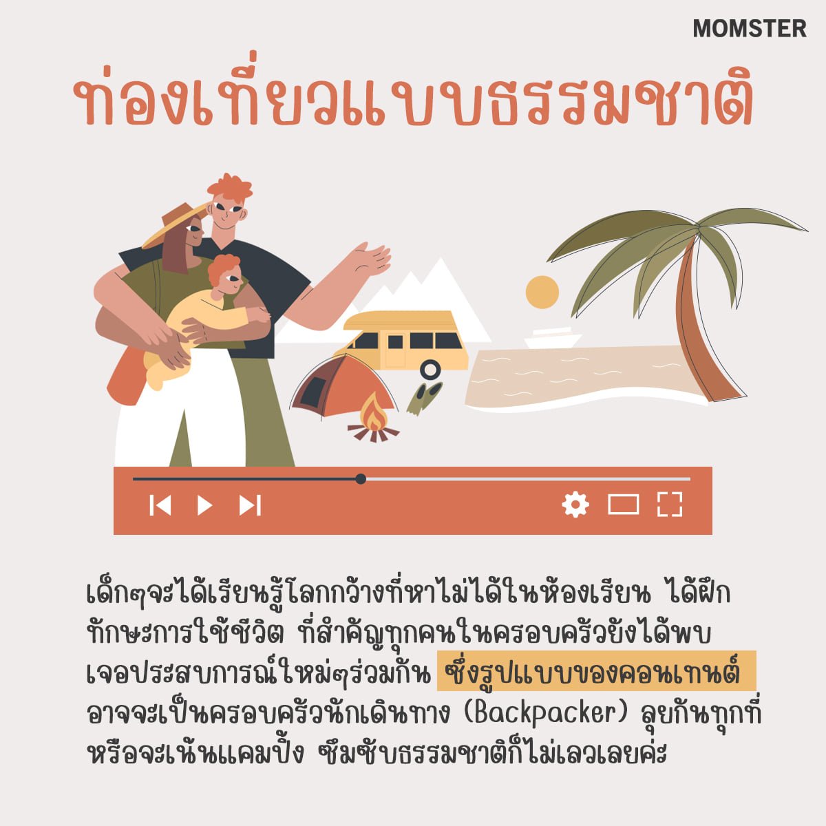 เป็นอีกหนึ่งสไตล์คอนเทนต์ที่มีประโยชน์กับเด็กๆ อย่างมาก เพราะเด็กๆ จะได้เรียนรู้โลกกว้างที่หาไม่ได้ในห้องเรียน และยังจะได้ฝึกทักษะการใช้ชีวิตที่สามารถนำไปประยุกต์ในอนาคตอีกด้วย ที่สำคัญยังเป็นการใช้เวลากับครอบครัวแบบเต็มที่ ได้ลองผิด ลองถูกด้วยกัน และได้พบเจอประสบการณ์ใหม่ๆ ร่วมกัน ซึ่งรูปแบบของคอนเทนต์อาจจะเป็นครอบครัวนักเดินทาง Backpacker ลุยด้วยกันทุกที่ ได้เรียนรู้ทั้งวัฒนธรรมและธรรมชาติพร้อมกัน หรือจะเน้นสายแคมปิ้ง ซึมซับธรรมชาติก็ไม่เลวเลยค่ะ