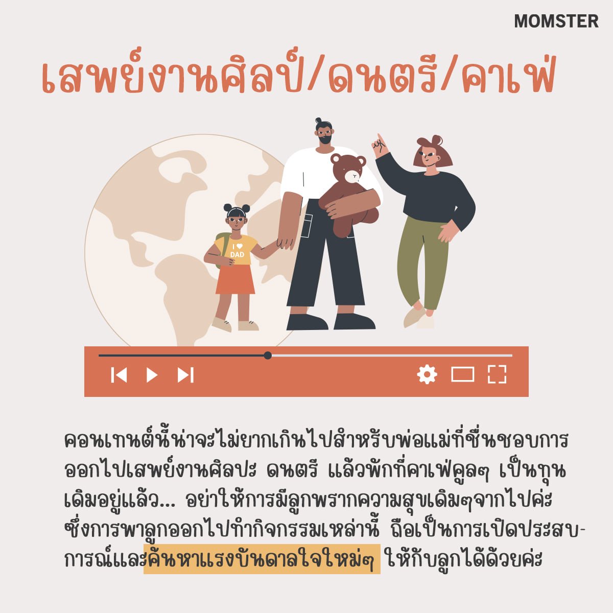 คอนเทนต์นี้น่าจะไม่ยากเกินไปสำหรับพ่อแม่ที่ชื่นชอบการออกไปเสพย์งานศิลปะ ดนตรี แล้วพักที่คาเฟ่คูลๆ เป็นทุนเดิมอยู่แล้ว เพราะฉะนั้นอย่าให้การมีลูกพรากความสุขเดิมๆ จากไป จงพาลูกออกไปสร้างคอนเทนต์ด้วยกันค่ะ จะเห็นว่าในกรุงเทพตอนนี้เริ่มมีงานศิลปะ นิทรรศการ จัดแสดงกันบ้างแล้ว การพาลูกที่เรียนออนไลน์มาอย่างหนักให้ออกจากหน้าจอแล้วไปซึมซับความงามภายนอก น่าจะช่วยผ่อนคลายความตึงเครียดได้บ้าง คอนเทนต์รูปแบบนี้นอกจากจะเป็นคอนเทนต์ที่ดีคอนเทนต์หนึ่งแล้ว ยังเป็นการเปิดโอกาสให้ลูกได้เห็นผลงานศิลปะ การฟังแนวเพลงใหม่ๆของคนอื่น เพื่อเรียนรู้และเป็นแรงบันดาลใจในการสร้างผลงานของตัวเองต่อไป