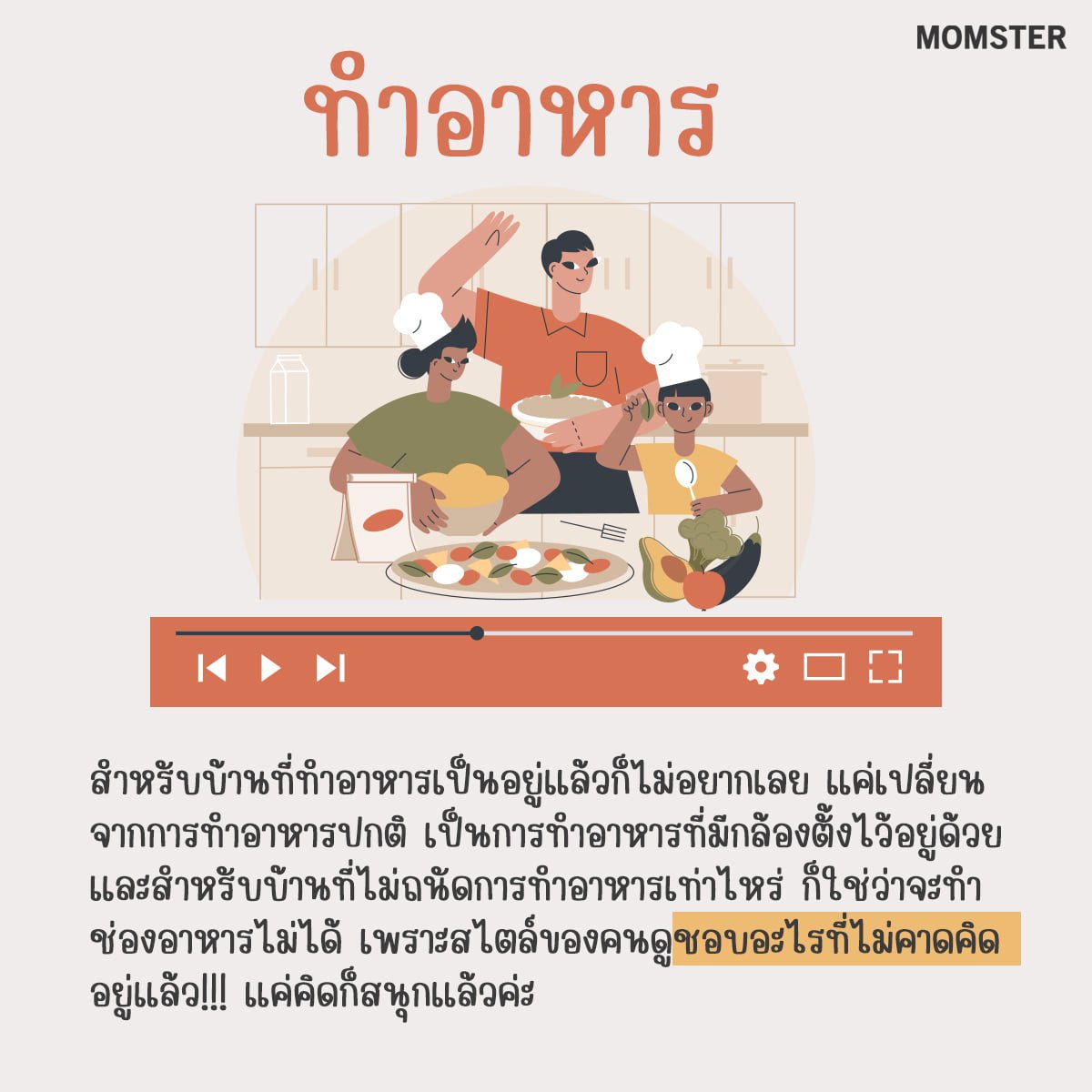สำหรับบ้านที่ทำอาหารเป็นอยู่แล้วก็ไม่อยากเลย แค่เปลี่ยนจากการทำอาหารปกติ เป็นการทำอาหารที่มีกล้องตั้งไว้อยู่ด้วย อาจจะมีลูกเล่นลูกชนให้คุณพ่อ คุณแม่สลับกันทำ แล้วคุณลูกก็เป็นลูกมือ ชวนกันพูดคุย หยิบจับนั่นนี่ หรือบาง EP เป็นการทำอาหารแข่งกันให้เพื่อนบ้านชิม หรือจะเป็นแข่งทำอาหารเช้าแลกกันกิน (อะไรก็ว่าไป) และสำหรับบ้านที่ไม่ถนัดการทำอาหารเท่าไหร่ ก็ใช่ว่าจะทำช่องอาหารไม่ได้ เพราะสไตล์ของคนดูชอบอะไรที่ไม่คาดคิดอยู่แล้ว!!! การที่พ่อแม่ ลูก ไม่มีใครทำอาหารเป็นเลย แล้วมาทำคอนเทนต์อาหารกัน แค่คิดก็สนุกแล้วค่ะ