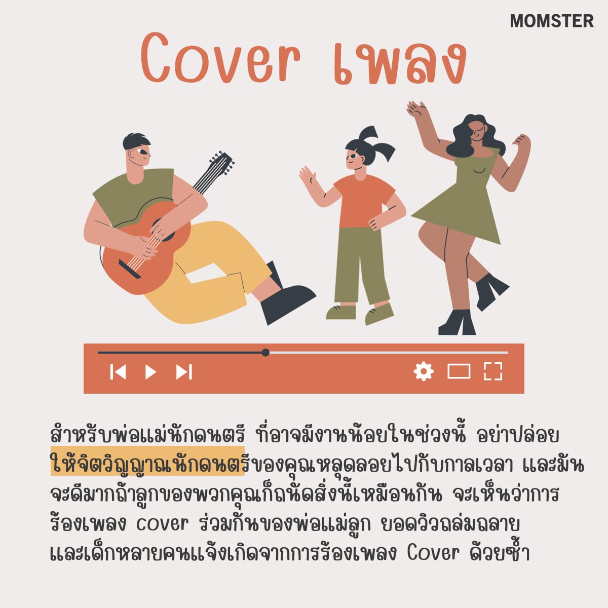 สำหรับคุณพ่อ คุณแม่ นักดนตรี ที่อาจจะมีงานน้อยในช่วงนี้ อย่าปล่อยให้จิตวิญญาณความเป็นนักดนตรีของคุณหลุดลอยไปกับกาลเวลา และมันจะดีมากถ้าลูกของพวกคุณก็ถนัดสิ่งนี้เหมือนกัน จะเห็นว่าช่องยูทูปต่างประเทศที่พ่อลูก หรือ แม่ลูก ร้องเพลง cover ร่วมกัน ตัวอย่างเช่นช่อง The Crosbys ยอดวิวถล่มถลาย และเด็กหลายคนแจ้งเกิดจากการร้องเพลง Cover กับพ่อแม่ด้วยซ้ำไป
