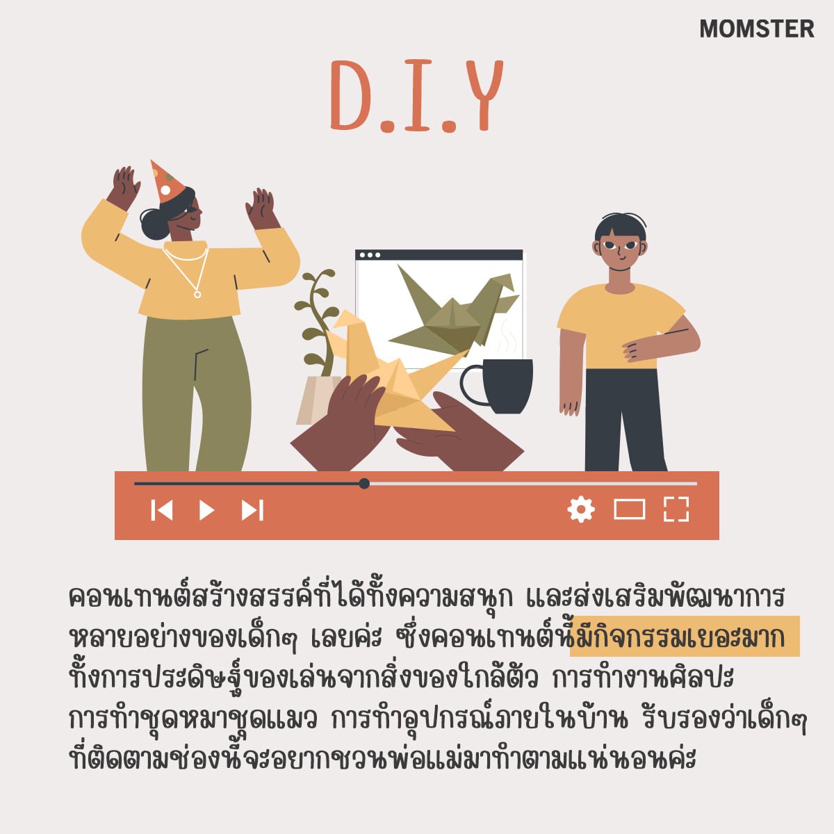 คอนเทนต์สร้างสรรค์ที่ได้ทั้งความสนุก และส่งเสริมพัฒนาการหลายๆ อย่างของเด็กๆ เลยค่ะ ซึ่งการ DIY เนี้ย มีให้ทำเยอะมาก ทั้งการพาลูกๆ ประดิษฐ์ของเล่นจากสิ่งของง่ายๆ ใกล้ตัว การทำงานศิลปะ การทำชุดหมาชุดแมว การทำอุปกรณ์ภายในบ้านใช้เอง รับรองว่าเด็กๆ ที่ติดตามช่องนี้จะอยากชวนพ่อแม่มาทำตามอย่างแน่นอนค่ะ