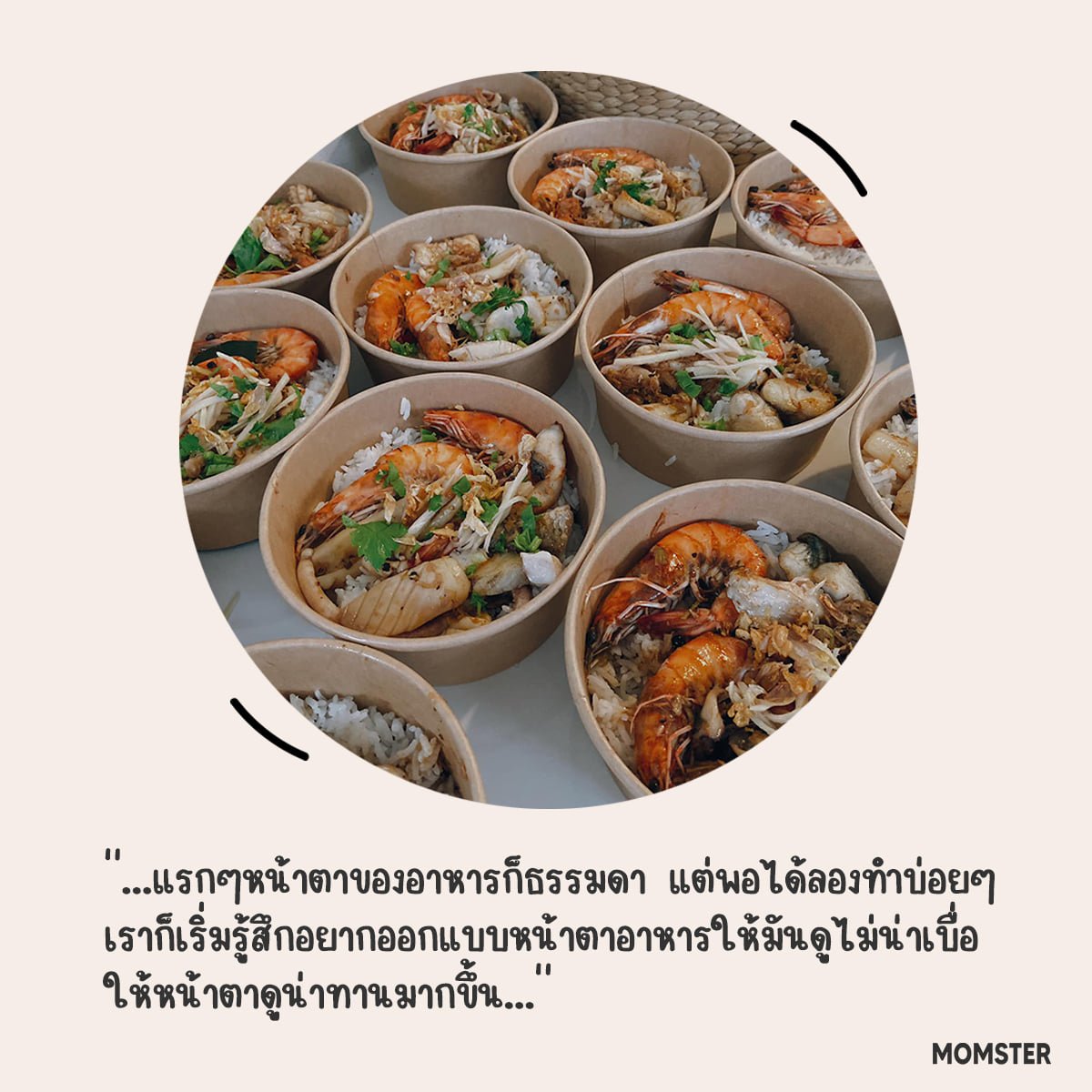 …พอเราเริ่มทำอาหารให้ลูกเราทาน เราก็มีความรู้สึกภูมิใจในอาหารที่ทำ ก็มีถ่ายรูปลงเฟส ซึ่งปกติก็ชอบถ่ายรูปอัพตสตอรี่ของตัวเองอยู่แล้ว ลงเฟสเอย ไอจีเอย แรกๆหน้าตาอาหารก็ธรรมดา แต่พอได้ลองทำบ่อยๆเราก็เริ่มรู้สึกอยากออกแบบหน้าตาอาหารให้มันดูไม่น่าเบื่อ ให้หน้าตาดูน่าทานมากขึ้น.… ทุกครั้งที่เราทำอาหาร เราเลยพยามจัดจานสวยๆ หามุมสวยๆ หาแสงสวยๆ ซึ้งไม่รู้ว่าวิธีมันถูกหรือผิด รู้แค่เราชอบ แล้วก็ถ่ายลงเฟสบุ๊คส่วนตัวเก็บไว้ จนเริ่มมีคนเข้ามาชื่นชม บางคนก็คอมเมนต์บอกว่าอยากทานอาหารของเรา บ่อยๆเข้าเราก็อดใจไม่ไหว เริ่มมีทำให้เพื่อนบ้านชิม จนเพื่อนบ้านเชียร์ให้ทำขาย แล้ววันนั้นเขาก็สั่งอาหารเรา 5 กล่อง… จะว่าไป 5 กล่องแรกที่เพื่อนบ้านสั่งในวันนั้น คือใบเบิกทางให้เราเริ่มทำอาหารขายจริงจังมาจนถึงวันนี้ค่ะ