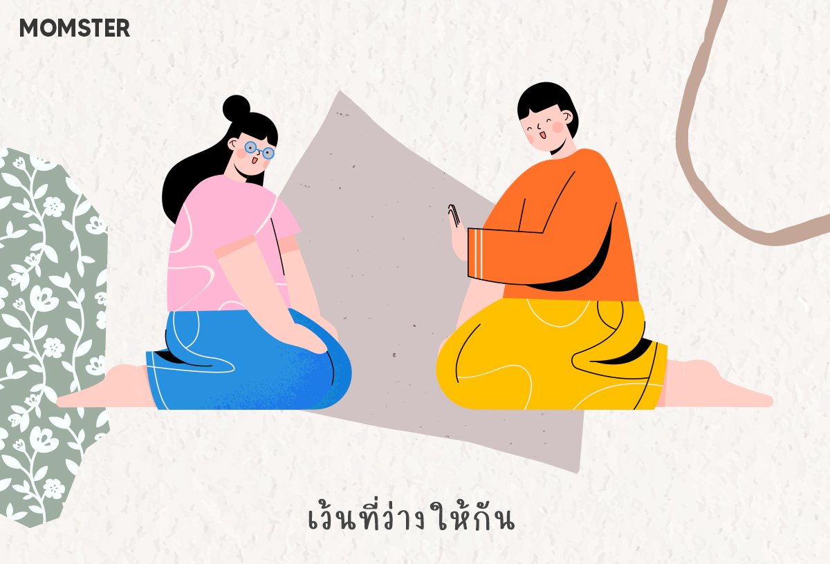 อาจจะแหวกแนวไปสักหน่อย แต่คนทุกคนต้องการเวลาที่เป็นส่วนตัว แม้อยู่ในบ้านเดียวกัน ครอบครัวเดียวกัน ก็ต้องมีการนัดเพื่อน ออกไปข้างนอก หรือบางเวลาที่อยากเก็บตัวสักนิดเพื่อทบทวนบางสิ่ง การให้เวลาที่เป็นส่วนตัวทำให้ความสัมพันธ์ราบรื่นและต่างฝ่ายต่างก็ไม่อึดอัดซึ่งกันและกัน