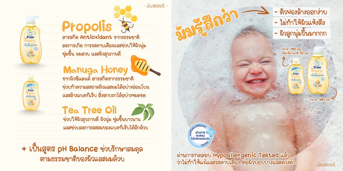 อย่างที่มัมบอกว่า ดีนี่ ออร์แกนิค โพรโพลิส เป็นสูตรปกป้องพิเศษ เพราะเค้ามี มานูก้าฮันนี่ จากนิวซีแลนด์ ซึ่งเป็นสารสกัดที่มาจากธรรมชาติ เลยช่วยทำความสะอาดผิวและผมได้อย่างอ่อนโยน แล้วยังล้างพวกแบคทีเรีย สิ่งสกปรกออกไปได้อย่างหมดจด และเป็นสูตร pH Balance ที่ช่วยรักษาสมดุลตามธรรมชาติของผิวและผมด้วย