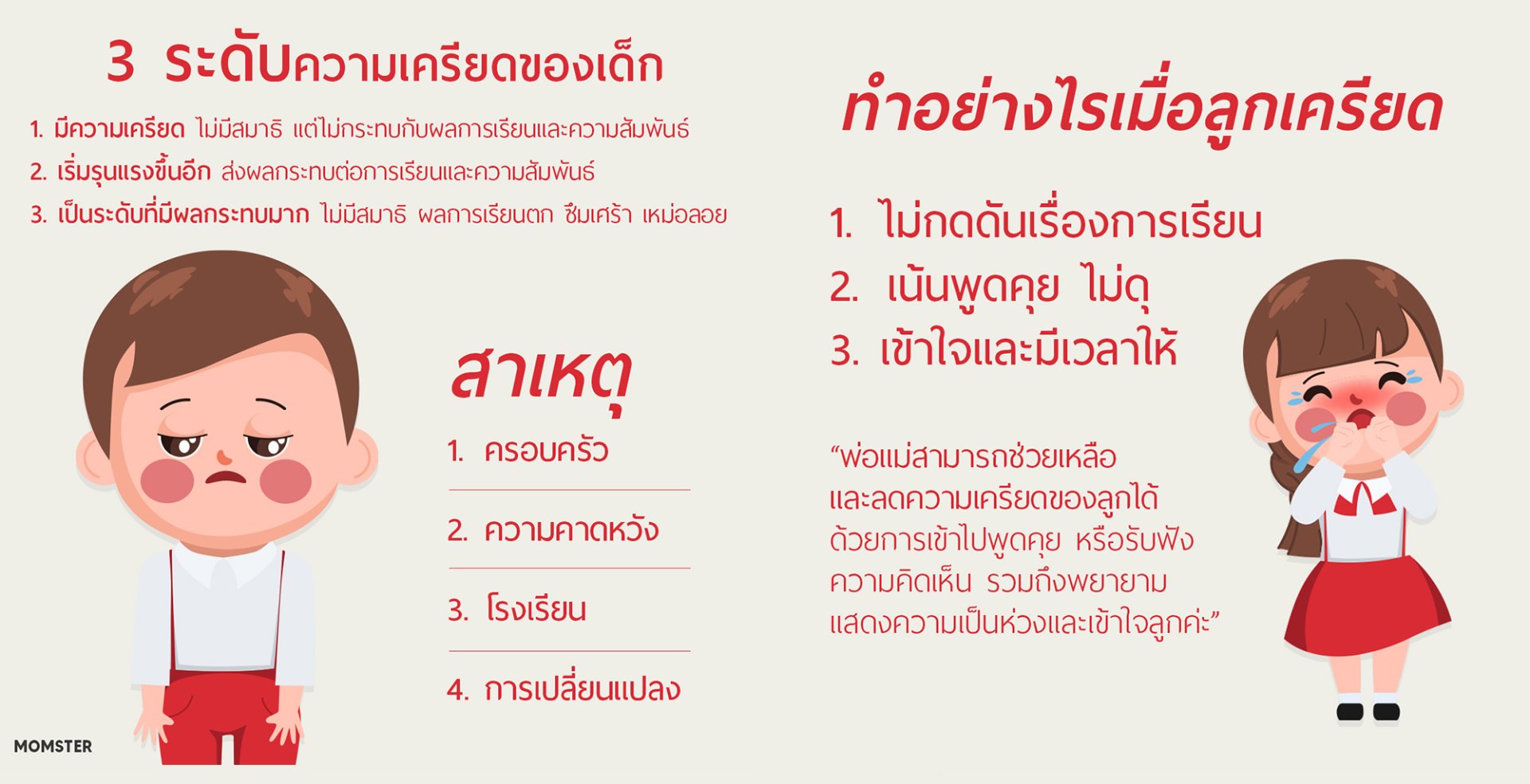 2. การเลี้ยงดูและความคาดหวัง ทั้งที่บ้านและที่โรงเรียน เด็กบางคนที่พ่อแม่จริงจังเรื่องเรียนหรือสอบแข่งขันมาก ต้องแบกรับความคาดหวังของทั้งพ่อแม่และครูก็ไม่ใช่เรื่องง่าย ทำให้เด็กเกิดความกดดัน พ่อแม่ที่เครียดก็ส่งผลให้เด็กเครียดด้วย