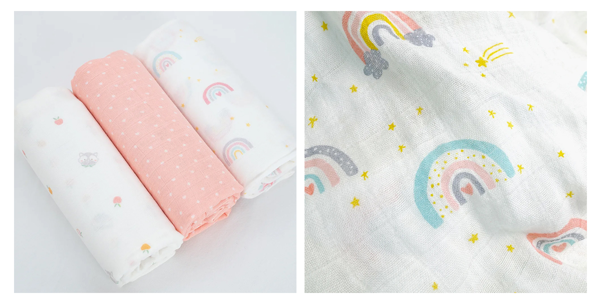 ผลิตจาก Cotton Muslin 100% คุณภาพสูง เนื้อผ้า เป็นทอหนาและนุ่ม มีรูโปร่ง อากาศถ่ายเทดี ทนทานต่อการใช้งานและการซัก สามารถเข้าเครื่องซักผ้าได้ ยิ่งซักยิ่งนุ่ม ส่วนตัวรู้สึกว่าแบรนด์นี้เขาโดดเด่นด้วยลาดลายน่ารักไม่เหมือนใคร แถมยังออกแบบมาเป็นคอลเลคชั่นที่ครบเซ็ท แล้วแพคเกจของแบรนด์ส่วนมาก สามารถนำไปเป็นของขวัญต้อนรับสมาชิกใหม่ได้ไม่อายใครเลยค่ะ