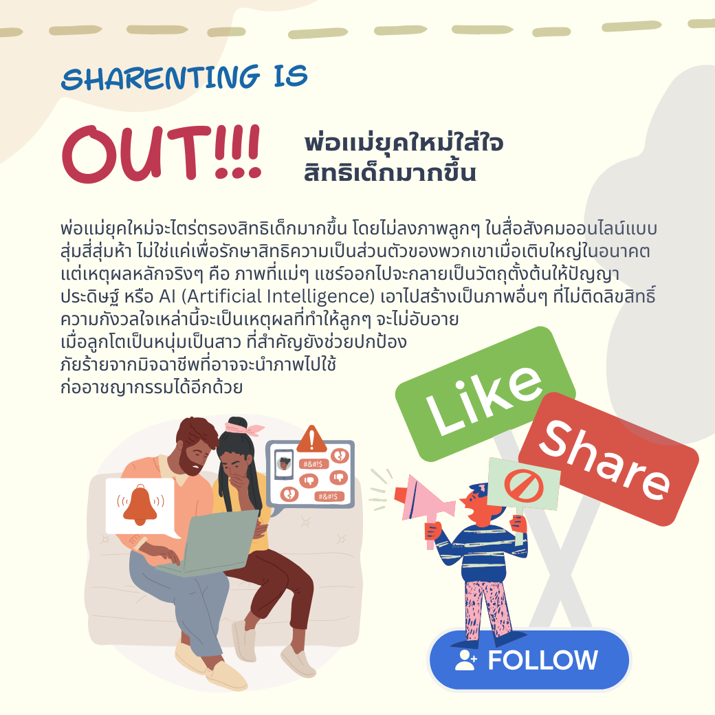 - พ่อแม่ยุคใหม่จะพิจารณา ไตร่ตรองสิทธิเด็กมากขึ้น โดยไม่ลงภาพลูกๆ ในสื่อสังคมออนไลน์ แบบสุ่มสี่สุ่มห้า ไม่ใช่แค่เพื่อรักษาสิทธิความเป็นส่วนตัวของพวกเขาเมื่อเติบใหญ่ในอนาคต แต่เหตุผลหลักจริงๆ คือ ภาพที่แม่ๆ แชร์ออกไปจะกลายเป็นวัตถุตั้งต้นให้ปัญญาประดิษฐ์ หรือ AI (Artificial Intelligence) เอาไปสร้างเป็นภาพอื่นๆ ที่ไม่ติดลิขสิทธิ์ ความกังวลใจเหล่านี้จะเป็นเหตุผลที่ทำให้ลูกๆ ของเราจะไม่อับอายในอนาคตเมื่อลูกโตเป็นหนุ่ม เป็นสาว อีกทั้งยังช่วยปกป้องภัยร้ายจากมิจฉาชีพที่อาจจะนำภาพไปใช้ก่ออาชญากรรมได้อีกด้วย
