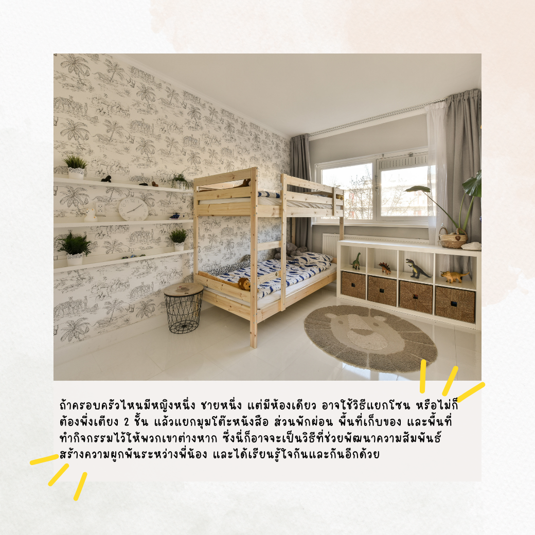 ถ้าครอบครัวไหนมีหญิงหนึ่ง ชายหนึ่ง แต่มีห้องเดียว อาจใช้วิธีแยกโซน หรือไม่ก็ต้องพึ่งเตียง 2 ชั้น แล้วแยกมุมโต๊ะหนังสือ ส่วนพักผ่อน พื้นที่เก็บของ และพื้นที่ทำกิจกรรมไว้ให้พวกเขาต่างหาก ซึ่งนี่ก็อาจจะเป็นวิธีที่ช่วยพัฒนาความสัมพันธ์ สร้างความผูกพันระหว่างพี่น้อง และได้เรียนรู้ใจกันและกันอีกด้วย