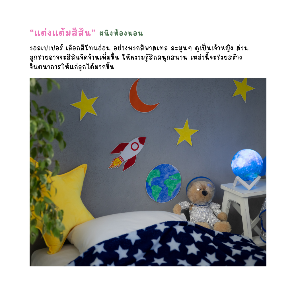 วอลเปเปอร์ เลือกสีโทนอ่อน อย่างพวกสีพาสเทล ละมุนๆ ดูเป็นเจ้าหญิง ส่วนลูกชายอาจจะสีสันจัดจ้านเพิ่มขึ้น ให้ความรู้สึกสนุกสนาน เหล่านี้จะช่วยสร้างจินตนาการให้แก่ลูกได้มากขึ้น