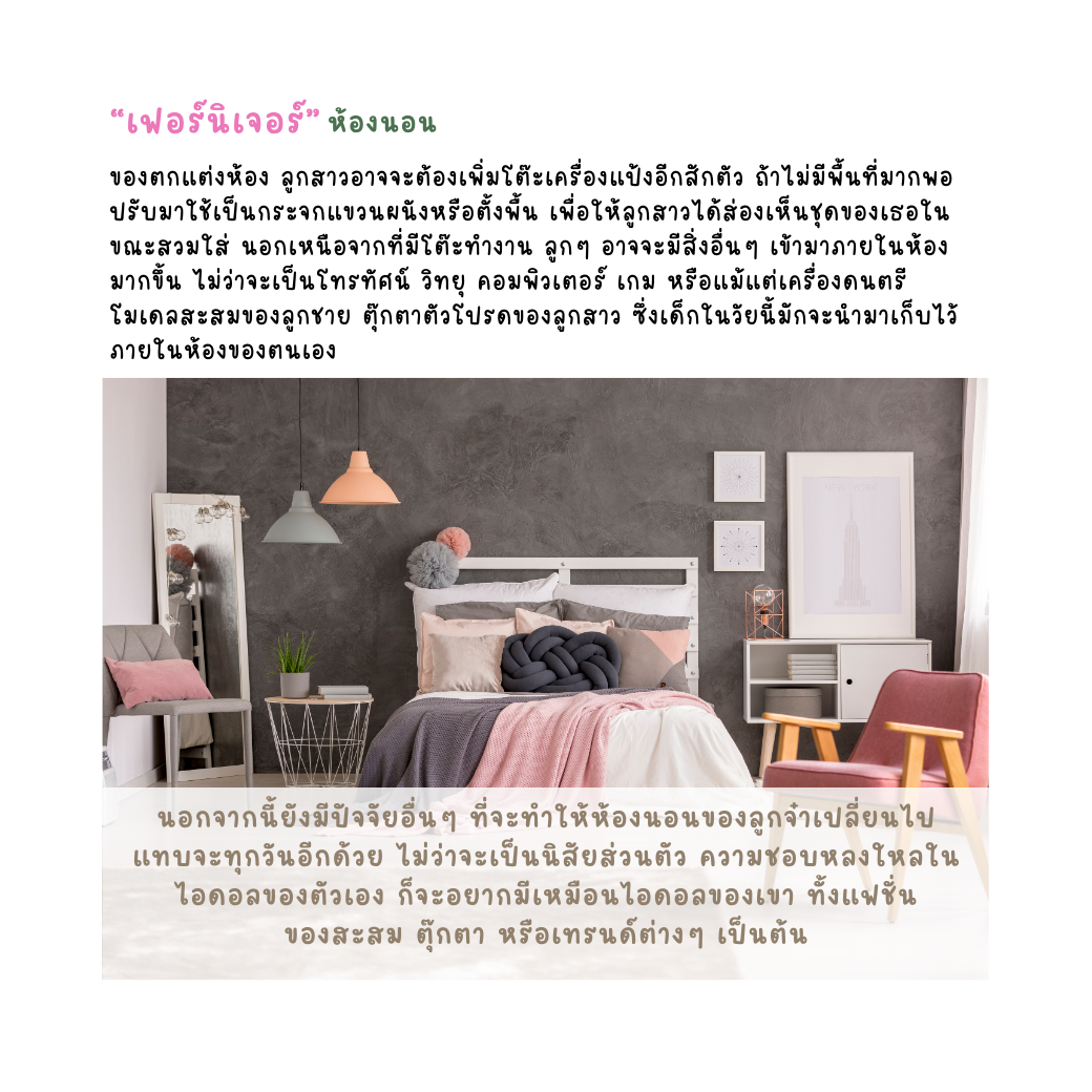 นอกจากนี้ยังมีปัจจัยอื่นๆ ที่จะทำให้ห้องนอนของลูกจ๋าเปลี่ยนไปแทบจะทุกวันอีกด้วย ไม่ว่าจะเป็นนิสัยส่วนตัว ความชอบหลงใหลในไอดอลของตัวเอง ก็จะอยากมีเหมือนไอดอลของเขา ทั้งแฟชั่น ของสะสม ตุ๊กตา หรือเทรนด์ต่างๆ เป็นต้น