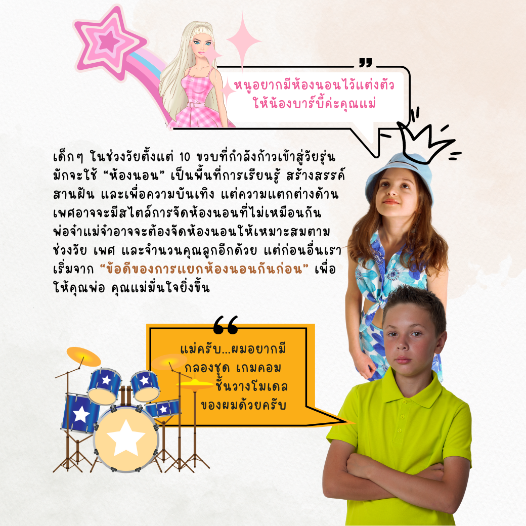 เด็กๆ ในช่วงวัยตั้งแต่ 10 ขวบที่กำลังก้าวเข้าสู่วัยรุ่นมักจะใช้ “ห้องนอน” เป็นพื้นที่การเรียนรู้ สร้างสรรค์ สานฝัน และเพื่อความบันเทิง แต่ความแตกต่างด้านเพศอาจจะมีสไตล์การจัดห้องนอนที่ไม่เหมือนกัน พ่อจ๋าแม่จ๋าอาจจะต้องจัดห้องนอนให้เหมาะสมตามช่วงวัย เพศ และจำนวนคุณลูกอีกด้วย แต่ก่อนอื่นเราเริ่มจาก “ข้อดีของการแยกห้องนอนกันก่อน” เพื่อให้คุณพ่อ คุณแม่มั่นใจยิ่งขึ้น
