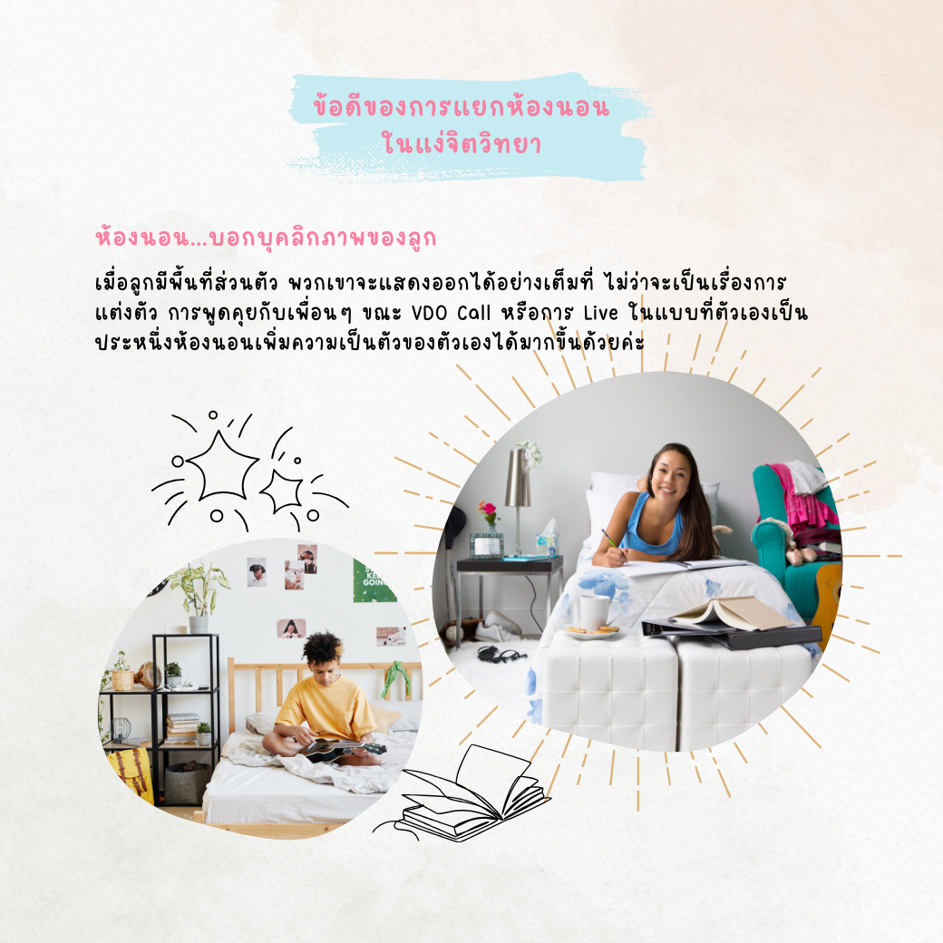 เมื่อลูกมีพื้นที่ส่วนตัว พวกเขาจะแสดงออกได้อย่างเต็มที่ ไม่ว่าจะเป็นเรื่องการ แต่งตัว การพูดคุยกับเพื่อนๆ ขณะ VDO Call หรือการ Live ในแบบที่ตัวเองเป็น ประหนึ่งห้องนอนเพิ่มความเป็นตัวของตัวเองได้มากขึ้นด้วยค่ะ