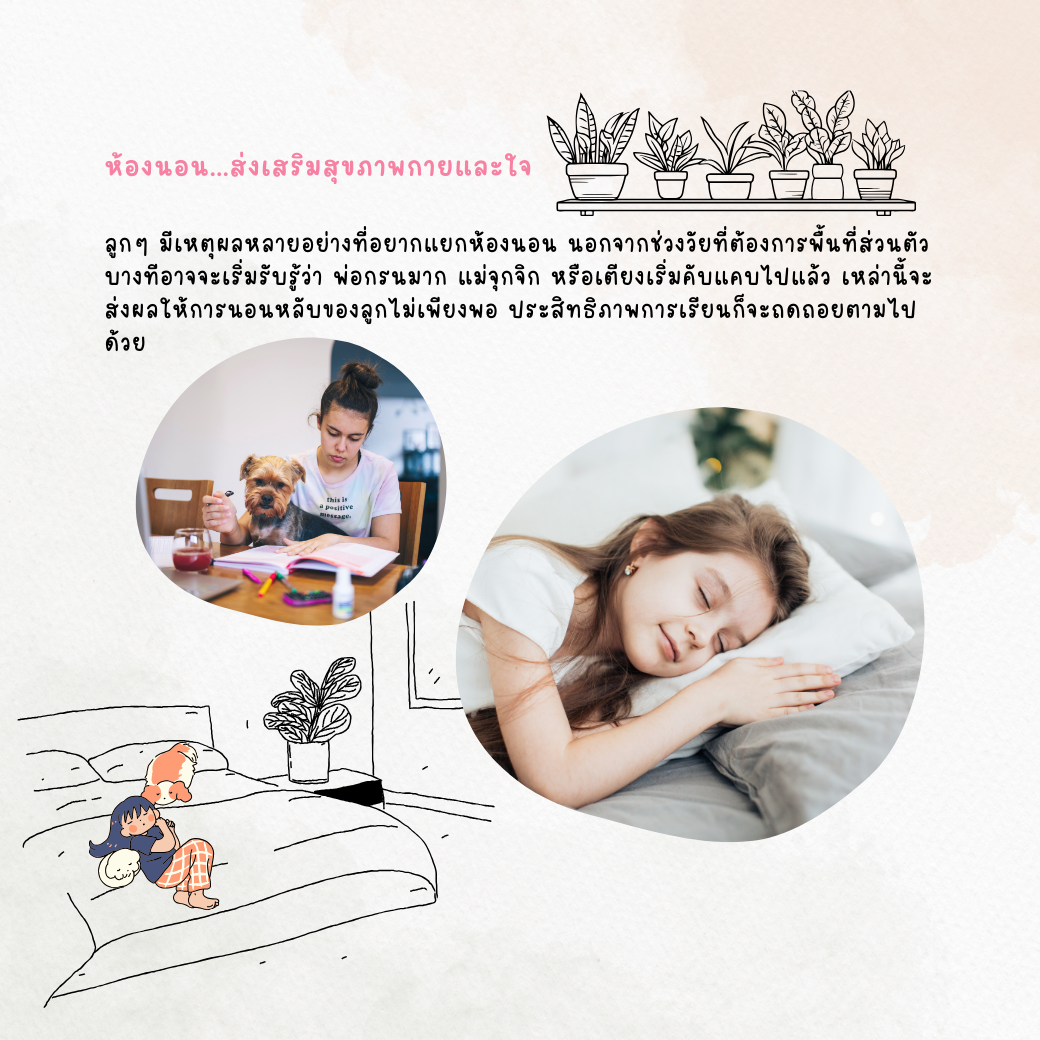 ลูกๆ มีเหตุผลหลายอย่างที่อยากแยกห้องนอน นอกจากช่วงวัยที่ต้องการพื้นที่ส่วนตัว บางทีอาจจะเริ่มรับรู้ว่า พ่อกรนมาก แม่จุกจิก หรือเตียงเริ่มคับแคบไปแล้ว เหล่านี้จะส่งผลให้การนอนหลับของลูกไม่เพียงพอ ประสิทธิภาพการเรียนก็จะถดถอยตามไปด้วย