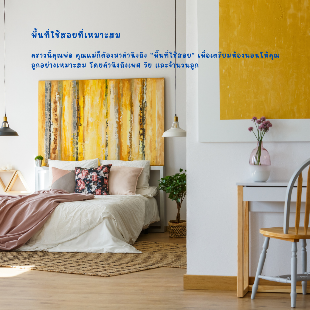 คราวนี้คุณพ่อ คุณแม่ก็ต้องมาคำนึงถึง “พื้นที่ใช้สอย” เพื่อเตรียมห้องนอนให้คุณลูกอย่างเหมาะสม โดยคำนึงถึงเพศ วัย และจำนวนลูก